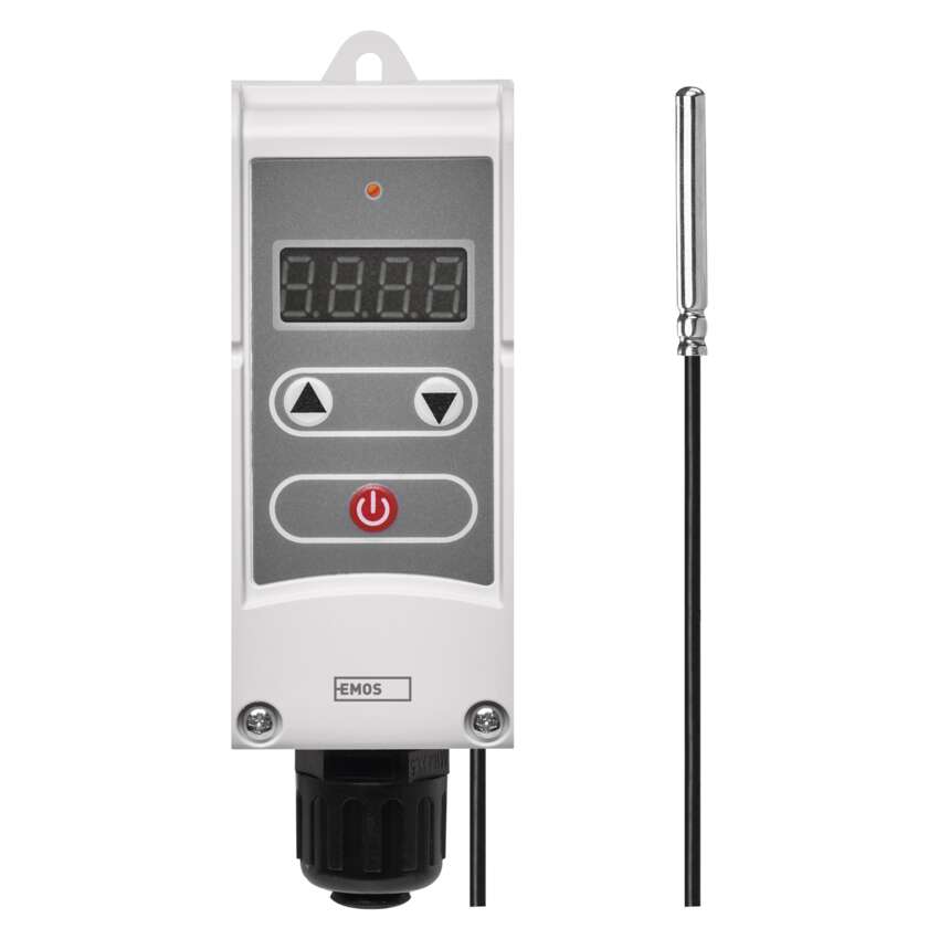 Anlegethermostat mit verlängertem Fühler zur Oberflächenmontage. Zum Abtasten der Wassertemperatur in Warmwasserspeichern oder in Heizungsanlagen.