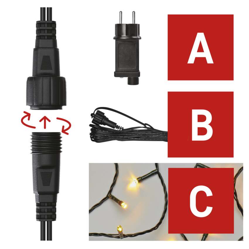 Die einzelnen LED-Leuchtelemente (C) des CONNECT SYSTEM STANDARD können zusammengeschaltet werden, kombinieren und mit Hilfe von Verlängerungskabeln und Splittern (B) verzweigen und schmücken auch entlegene Orte damit. Durch die schrittweise Erweiterung des CONNECT SYSTEMS mit zusätzlichen Komponenten kann eine professionelle und großflächige Beleuchtung ohne hohe Anfangsinvestitionen erreicht werden. Die zusammengeschaltete LED-Beleuchtung ist somit die ideale Wahl für spektakuläre Außendekorationen, bei denen herkömmliche Kettenlängen nicht ausreichen. Jeder kann das System tatsächlich installieren.