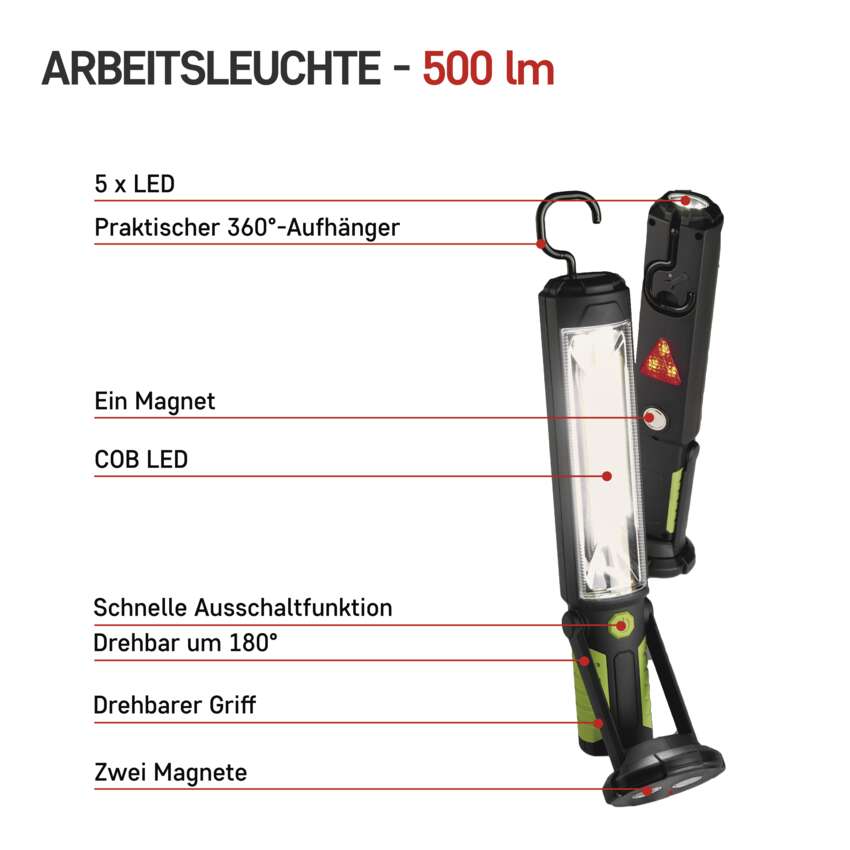| Lichtstrom | COB LED 50 % – 270 lm, COB LED 100 % – 500 lm, 5× LED 15 lm |
