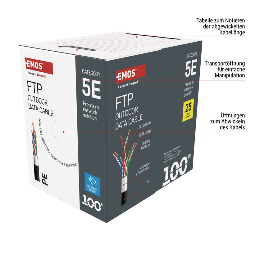 | Kennzeichnung des Kabels | FTP Cat5E PE OUTDOOR 1 – 100 m |