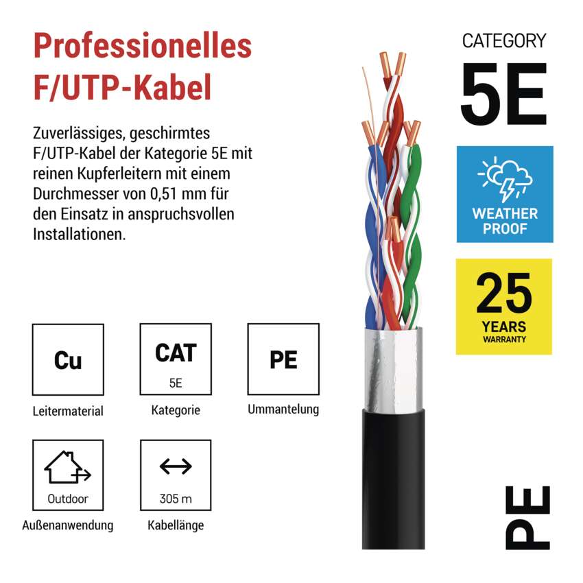 Das professionelle abgeschirmte FTP (F/UTP) Installationskabel der Kategorie 5E ist für die zuverlässige Datenübertragung unter anspruchsvollen Bedingungen bei Standardlängen der strukturierten Verkabelung (bis zu 100 m) ausgelegt. Dank der Leiter aus reinem Kupfer (Cu) mit einem Durchmesser von 0,51 mm und einer perfekt wirksamen Abschirmung bietet es eine stabile Leistung und minimale Signalverluste bei der Übertragung bis zu 2,5/5GBASE-T.