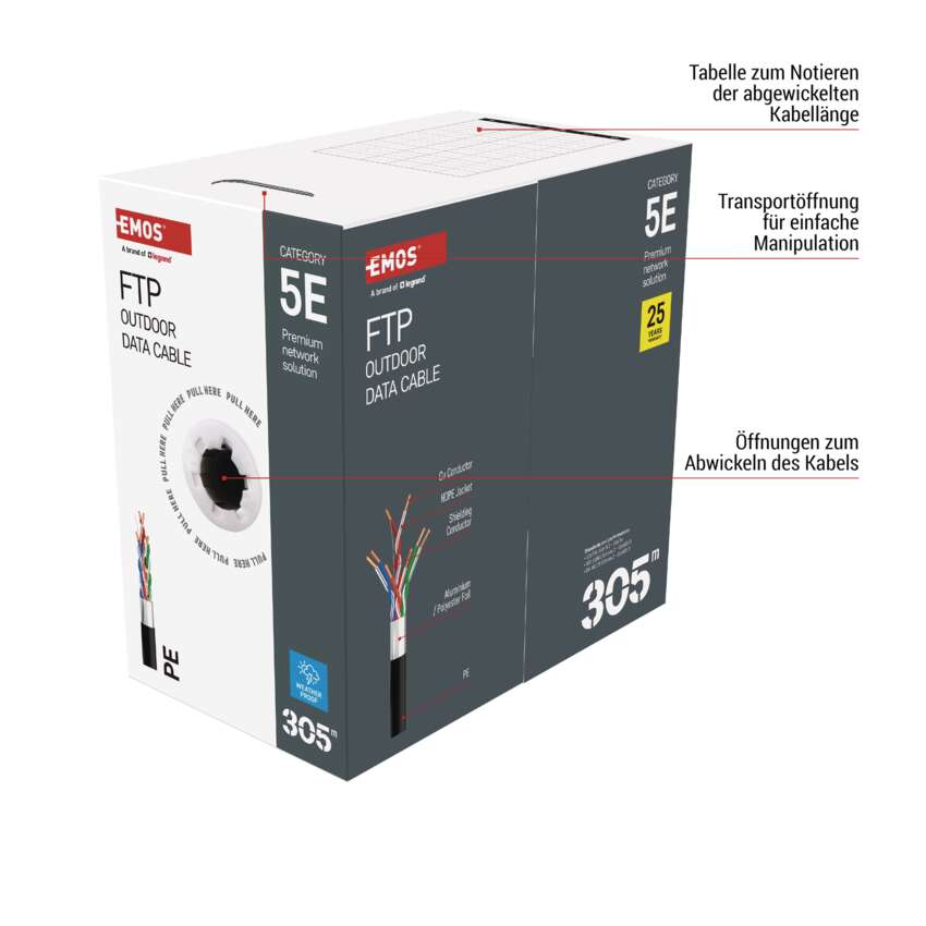 | Kennzeichnung des Kabels | FTP Cat5E PE OUTDOOR 1 – 305 m |
