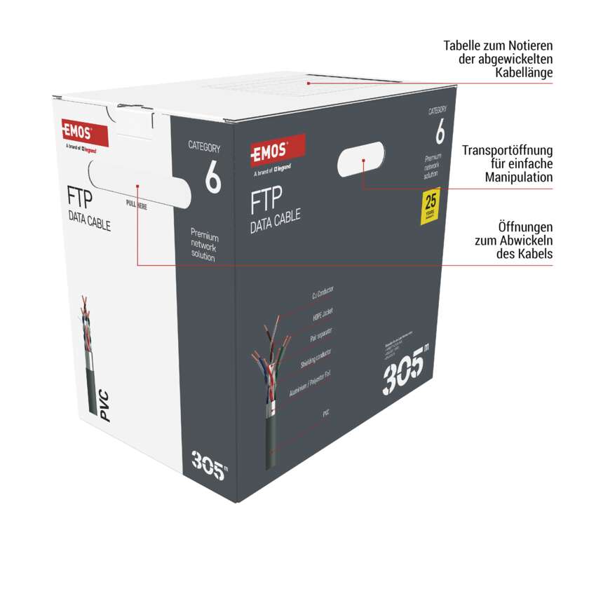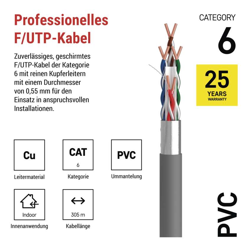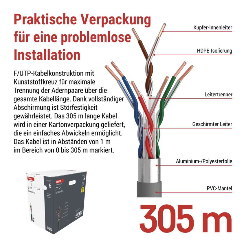 | Kennzeichnung des Kabels | FTP CAT 6 PVC 1 – 305 m |