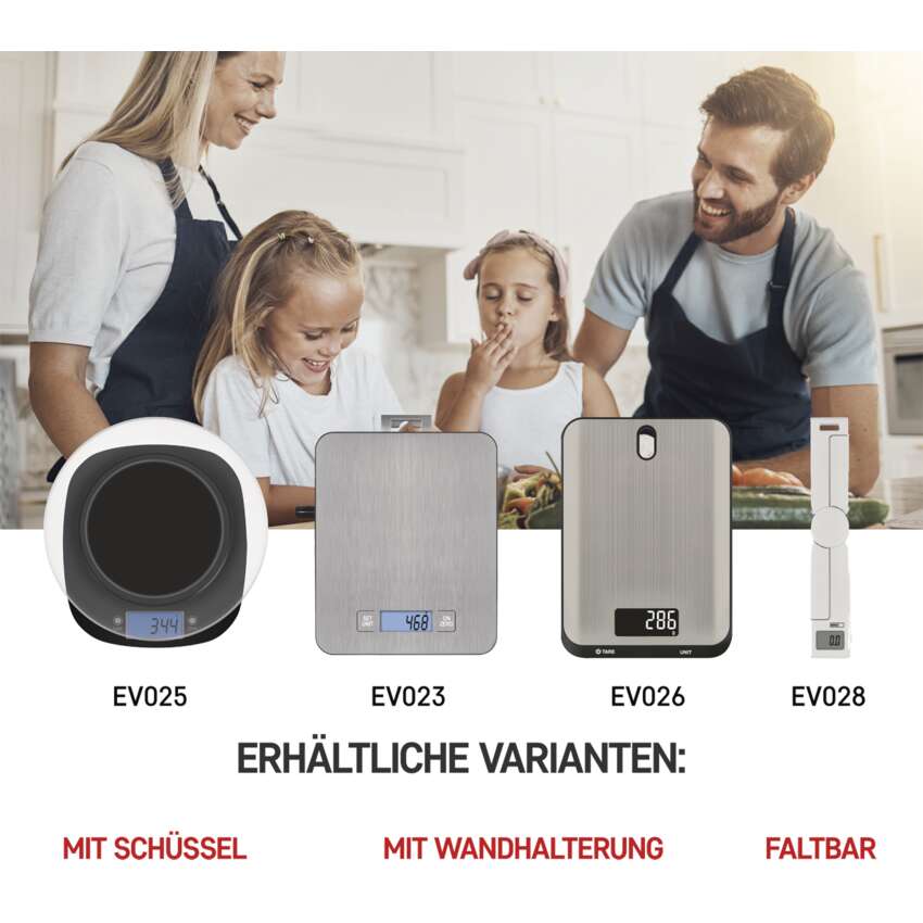 Sie brauchen eine zuverlässige Küchenwaage, die auch schwere Lasten tragen kann? Mit der digitalen Küchenwaage EV023 können Sie Ihre Karotten- oder Apfelernte abwiegen, Marmelade einkochen oder sich dank der Maximallast von 15 kg an die große Backarbeit machen. Der Vorteil ist die hohe Wiegegenauigkeit und die TARE-Wiegefunktion. Mit Uhr und Minutenzeiger wird die Edelstahlwaage zu einem multifunktionalen Helfer für jede moderne Küche. Die Bedienung ist einfach und selbst Kinder können damit umgehen.