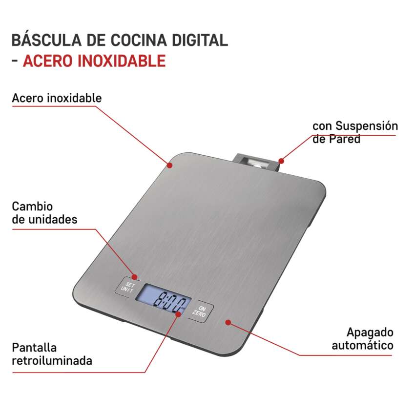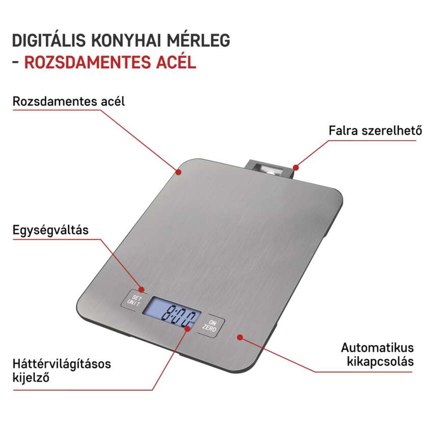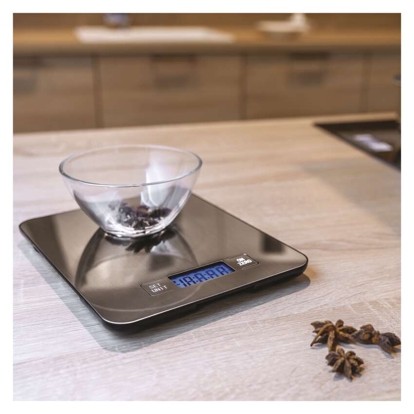 Digitale Küchenwaage mit TARA-Funktion .Wiegemöglichkeit bis 15 kg. Die Oberfläche besteht aus rostfreiem Stahl.