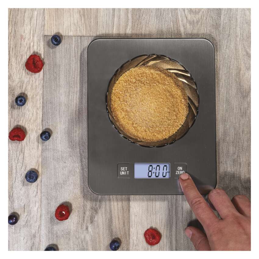 Die Waage wird mit zwei 1,5 V AAA-Batterien betrieben, die nicht enthalten sind. Die Waage überwacht ihren Stromverbrauch selbst, und wenn Sie sie nicht manuell ausschalten, schaltet sie sich nach einer Weile automatisch ab. Eine Batteriestatusanzeige warnt Sie, wenn die Batterie bald ausgetauscht werden muss, so dass die Waage immer bereit ist, mit Ihnen zu backen oder zu kochen.