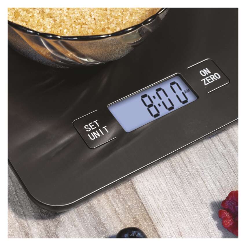 Der Vorteil der Waage ist das gut ablesbare hinterleuchtete Display. Auch bei schlechten Lichtverhältnissen können Sie das genaue Gewicht problemlos erkennen. Bei der Arbeit in der Küche werden Sie die Zeitanzeige und die Minutenfunktion nützlich finden. Die Waage wird zu Ihrem Begleiter, den Sie gerne zur Hand und im Blick haben werden - durch die ausziehbare Aufhängeschlaufe.