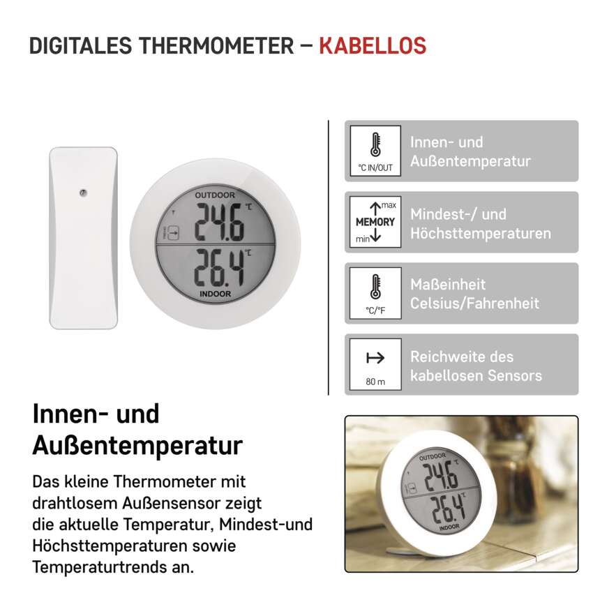 Außentemperatur -30 °C bis +50 °C, Auflösung 0,1 °C