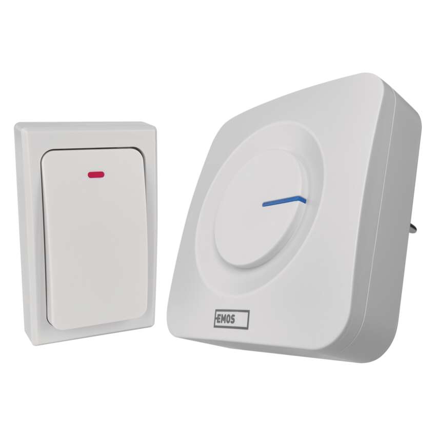 Die moderne EMOS-Türklingel in elegantem Weiß hat abgerundete Formen und leuchtet mit zwei LEDs in die Welt, um ihre einwandfreie Funktion anzuzeigen. Die LED auf dem Druckknopf leuchtet rot und die LED auf der Glocke ist blau. Die beiden Teile des Sets kommunizieren über 433,92 MHz-Funkwellen miteinander.