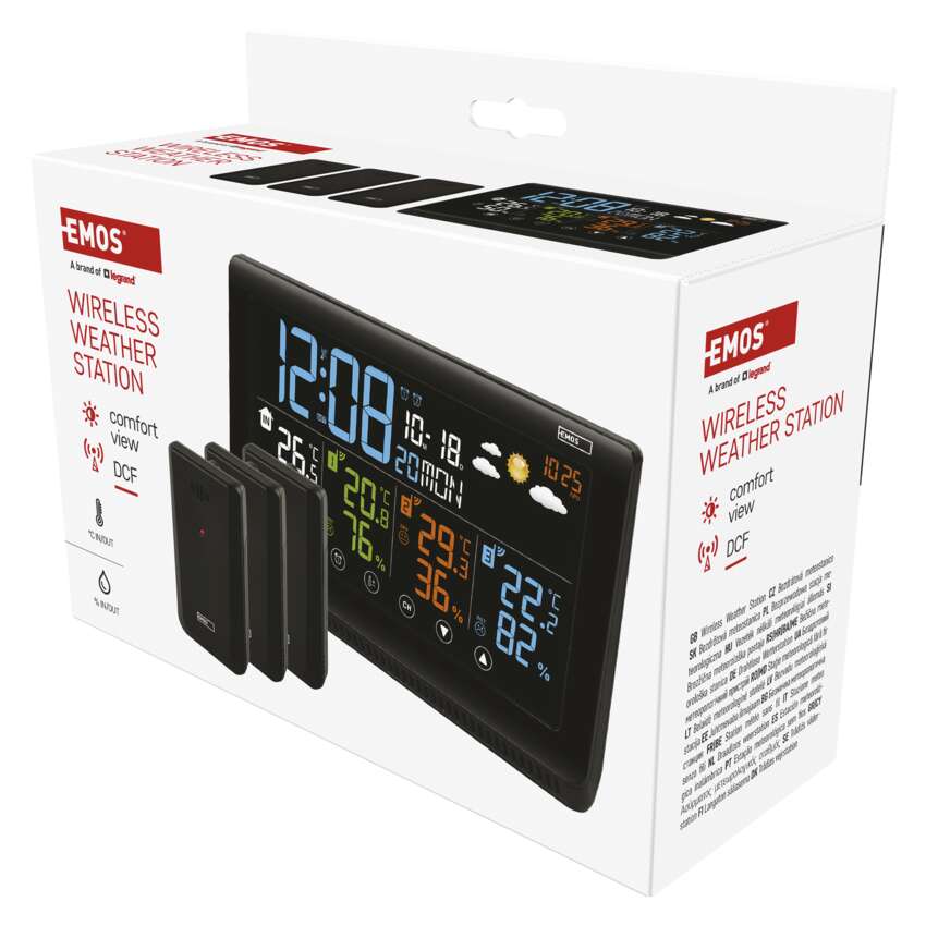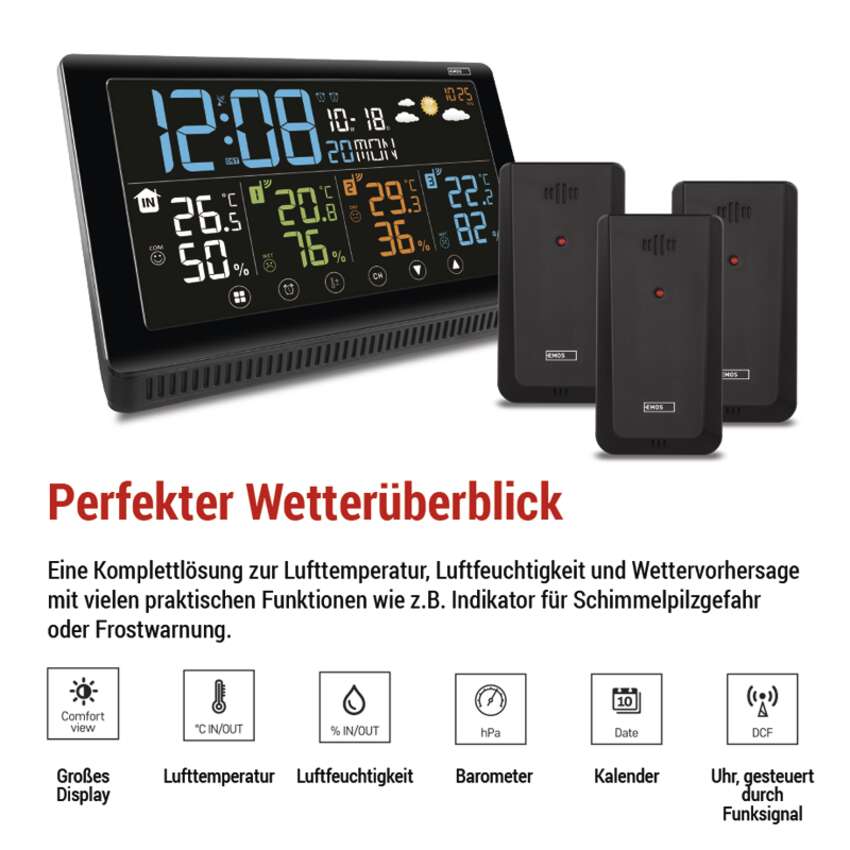 Wir präsentieren Ihnen eine Premium-Wetterstation, die zu einem unverzichtbaren Helfer in Ihrem Zuhause wird. Diese Wetterstation misst Außen- und Innentemperatur und Luftfeuchtigkeit, zeigt Zeit, Datum, Minimal- und Maximaltemperatur an und warnt vor Frost. Sie sagt zuverlässig das Wetter voraus und zeigt den Drucktrend an. Die praktischen zwei Weckfunktionen oder die DCF-Signal-gesteuerte Uhr erleichtern Ihnen den Alltag.