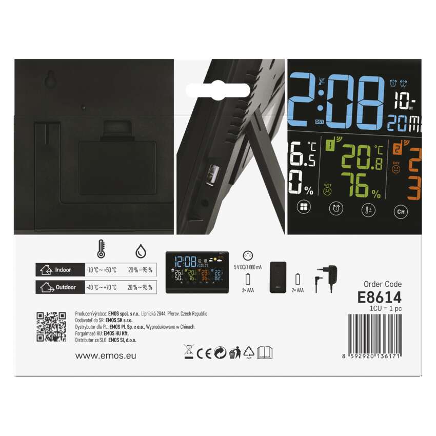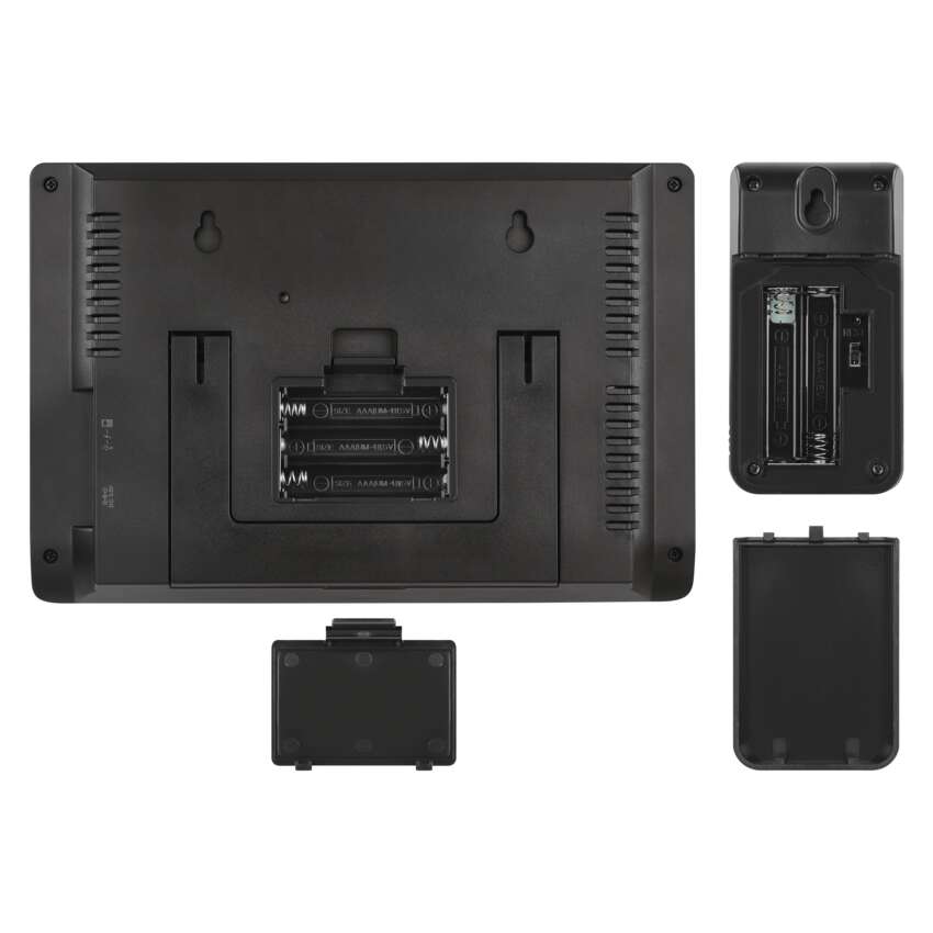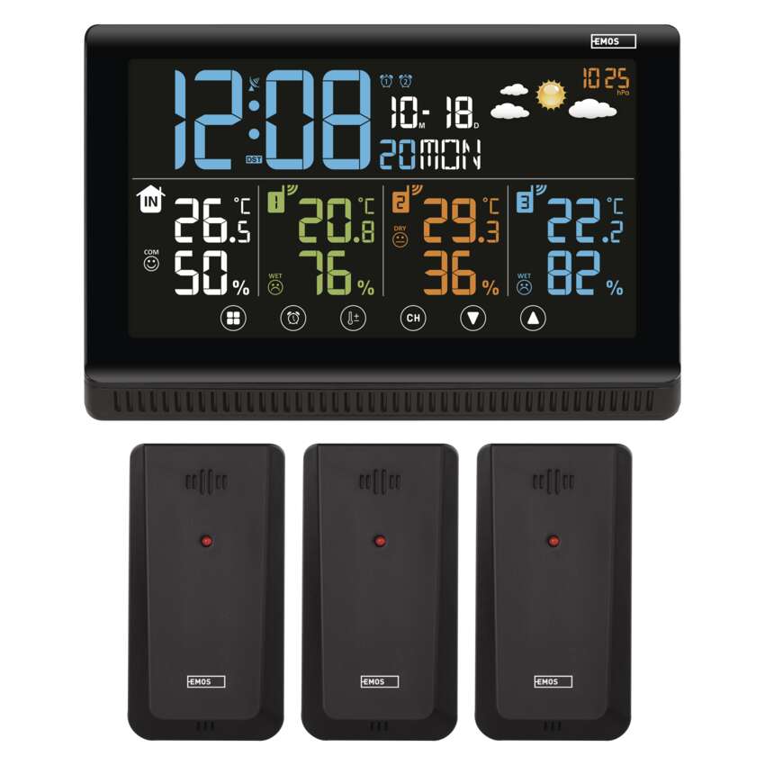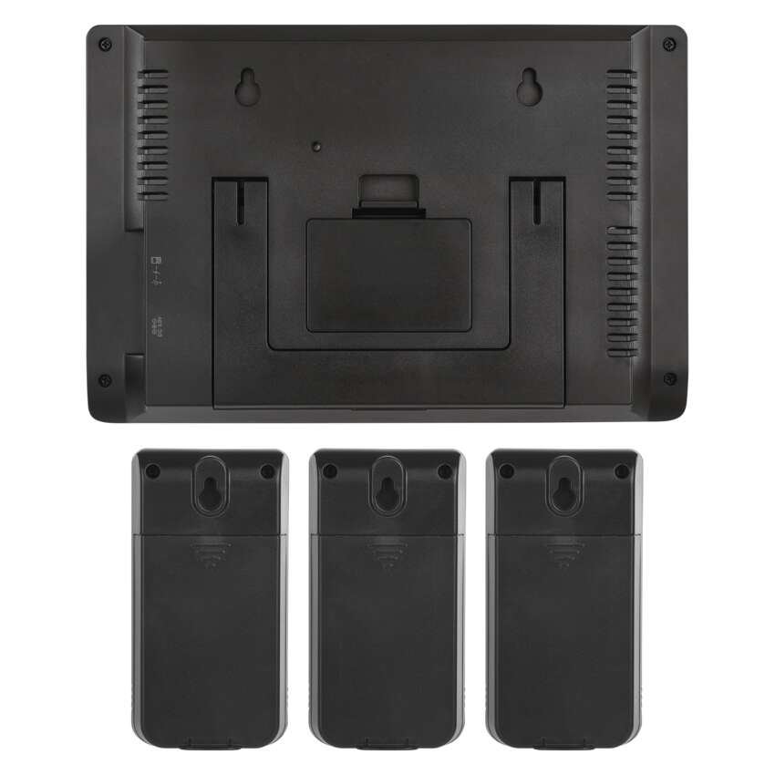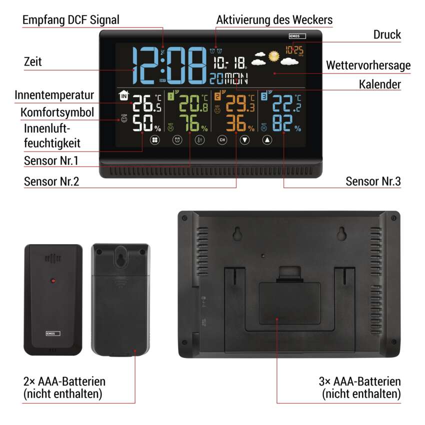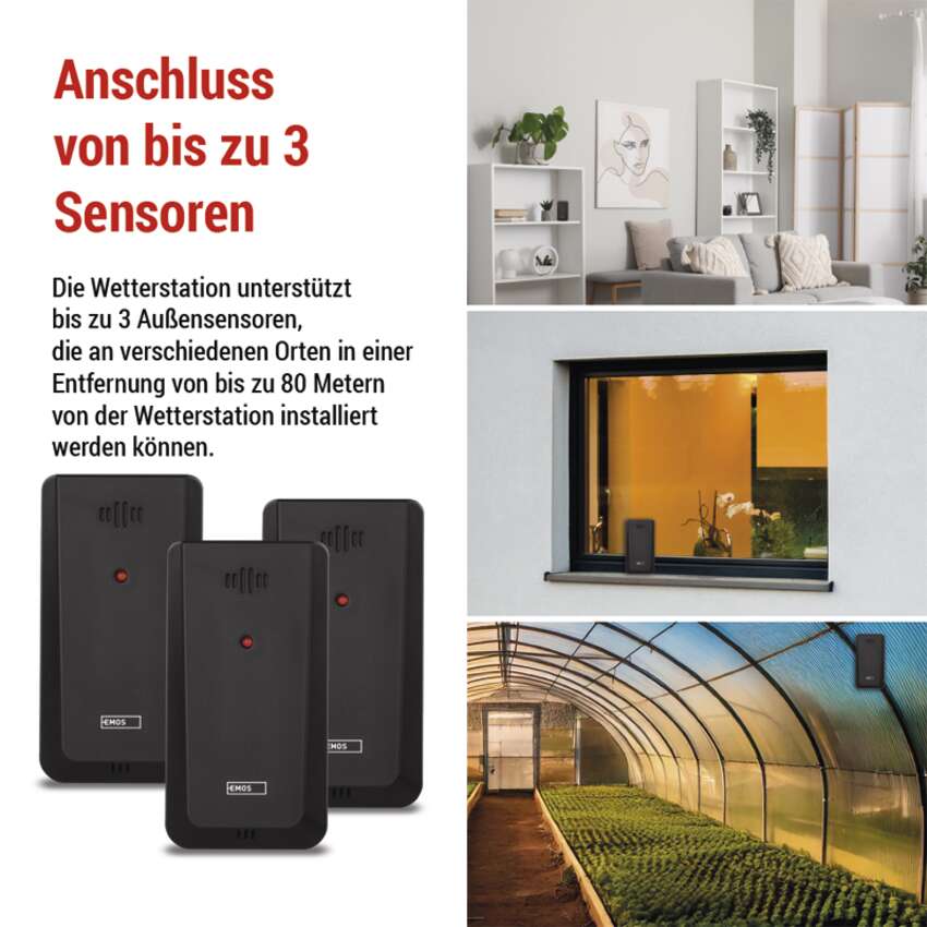 Ausgangssensoren, die mit 2× AAA-Batterien betrieben werden, können je nach Bedarf sowohl im Innen- als auch im Außenbereich platziert werden. Im Paket enthalten sind 3 Ausgangssensoren. Die Wetterstation misst die Innentemperatur zwischen -10 °C bis +50 °C und die Außentemperatur zwischen -40 °C bis +70 °C mit einer Auflösung von 0,1 °C.