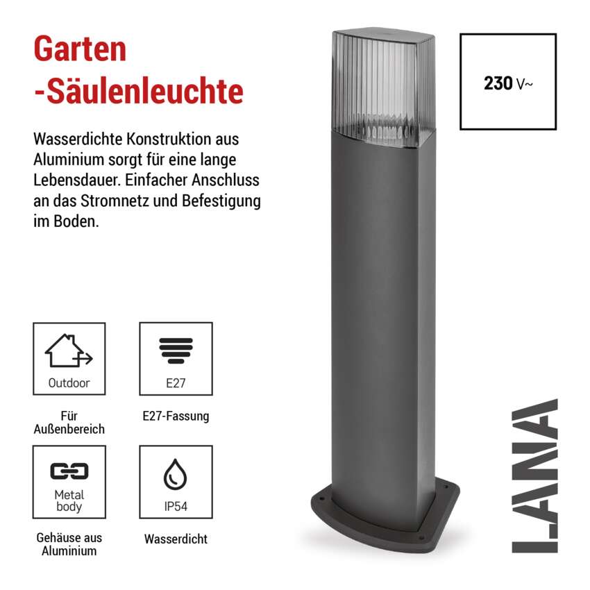 Die Gartenleuchten der Serie LANA verbinden elegantes Design mit hochwertiger Beleuchtung und sind damit die perfekte Ergänzung für jeden Außenbereich. Dank ihrer präzisen Verarbeitung und langlebigen Materialien bieten sie zuverlässige Leistung unter allen Bedingungen. Das LANA-Sortiment bietet eine Vielzahl von Gartenleuchtenmodellen, einschließlich Wand- und Säulenoptionen, so dass Sie eine Lösung wählen können, die Ihren Bedürfnissen und dem Stil Ihres Gartens entspricht.