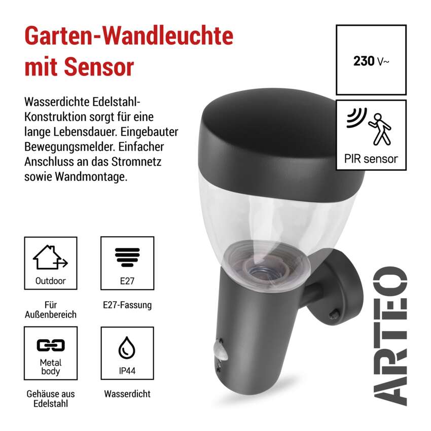 Garten-Wandleuchte ARTEO mit Dämmerungssensor, 16,4 x 12 x 29,5 cm, 1 x E27, 15 W