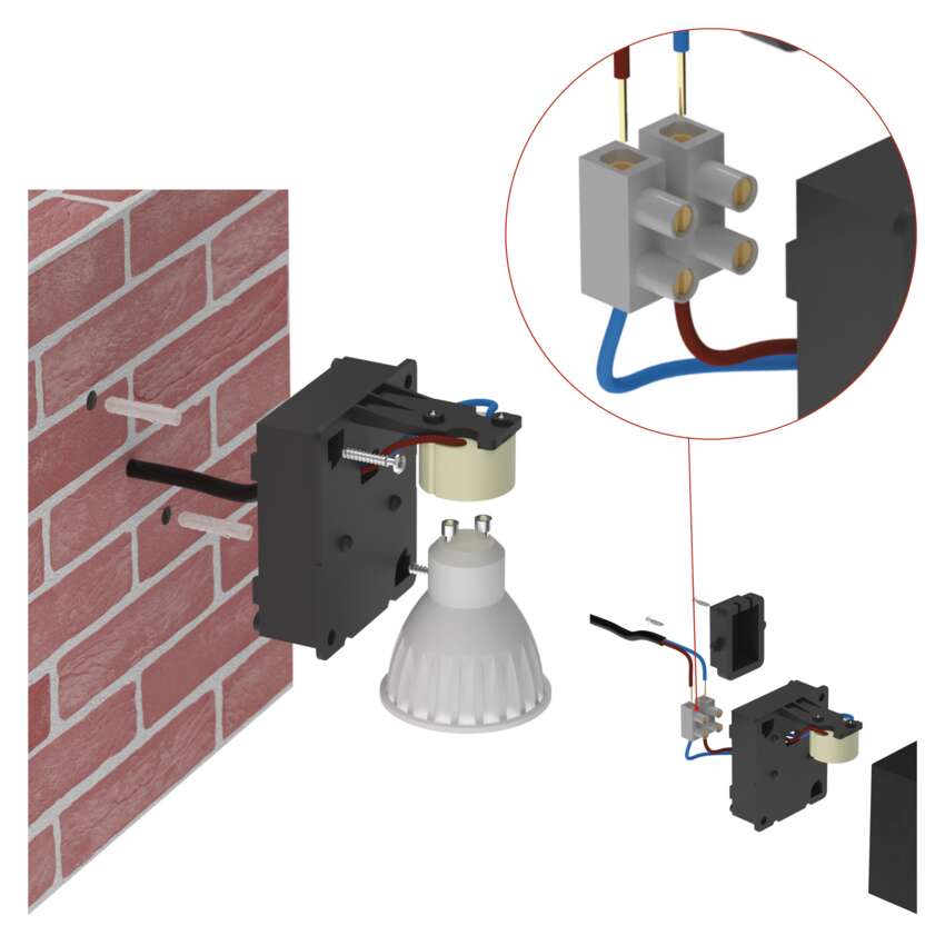Die Leuchten müssen fest auf einem geeigneten Sockel befestigt und an eine 230 VAC Netzversorgung angeschlossen werden, die gesamte Verkabelung sollte von einer entsprechend qualifizierten Person durchgeführt werden