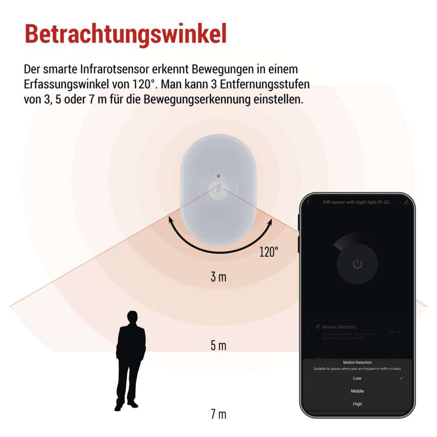 Dieser fortschrittliche Bewegungssensor wurde entwickelt, um automatisch Bewegungen in einem Winkel von 120° bis zu 7m zu erkennen und Sie mit einer weichen Nachtbeleuchtung zu versorgen, um einen sicheren Weg im Dunkeln zu gewährleisten. Verbinden Sie sich mit anderen intelligenten Geräten, um Automatisierungen zu erstellen, die Ihnen die Kontrolle über Ihr Zuhause geben. Wenn Bewegung erkannt wird, sendet es eine Benachrichtigung an mobile Geräte über eine App, die für Android und iOS verfügbar ist.