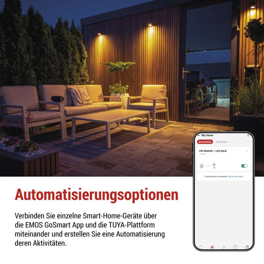 Schaffen Sie sich Ihr eigenes smartes Zuhause mit EMOS GoSmart Smart Devices und anderen TUYA-kompatiblen Geräten. Verbinden Sie einzelne Produkte, richten Sie eine Automatisierung ihrer Aktivitäten ein und steuern Sie sie aus der Ferne mit der vollständig lokalisierten und intuitiven Mobil-App.