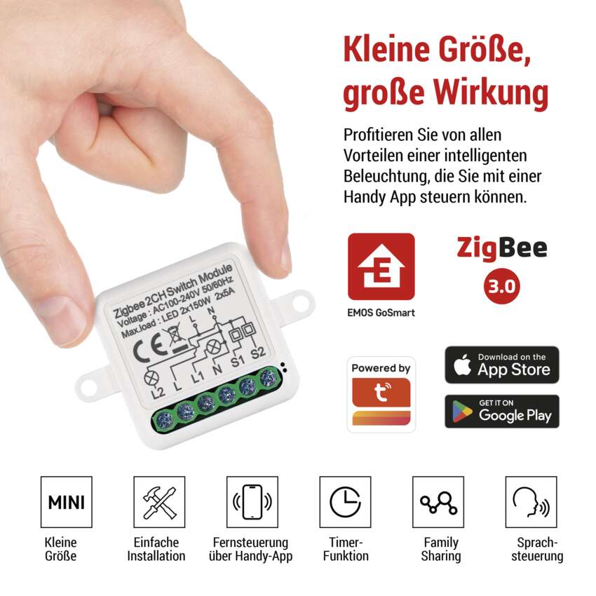 Steuern Sie das Modul mit einem ZigBee-Gateway und koppeln Sie es mit der EMOS GoSmart Mobile App, die für Android und iOS erhältlich ist. Da die Module permanent mit Strom versorgt werden, fungieren sie auch als Extender für Ihr ZigBee-Signal, wodurch Sie eine immer größere Anzahl von ZigBee-Geräten in einem einzigen Netzwerk verwalten können.