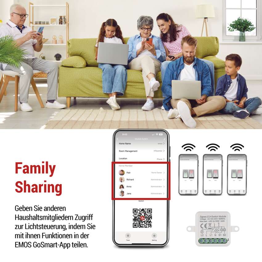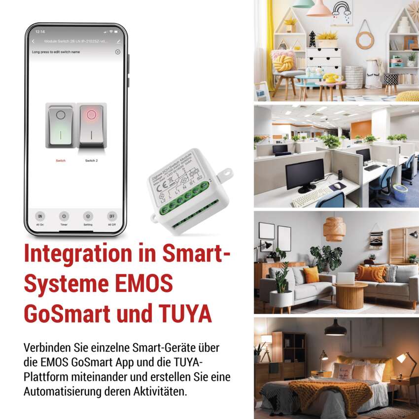 Das intelligente Modul kann mit anderen Geräten in Ihrem Zuhause verbunden werden (Uhren, Licht, Tür-, Fenster- und Heizungssensoren). Nach der Kopplung mit der EMOS GoSmart Mobile App können Sie Zeiten für einzelne Geräte automatisieren und planen. Schalten Sie zum Beispiel automatisch das Licht ein, wenn Sie im Urlaub sind. Schaffen Sie sich ein smartes Zuhause, das sich Ihren Bedürfnissen anpasst.