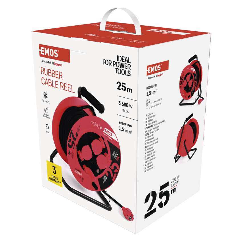 Das EMOS-Trommelverlängerungskabel mit einem Leiterquerschnitt von 1,5 mm2 und einer Länge von 25 m ist komplett aus hochwertigen Materialien gefertigt und hält dem Außeneinsatz stand. Die drehbare Trommel ermöglicht ein komfortables, schnelles und einfaches Arbeiten.