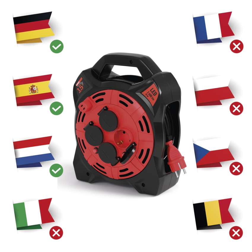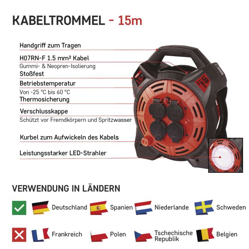 Die Verlängerungskabeltrommel mit LED-Reflektor ermöglicht den Anschluss von bis zu 4 elektrischen Geräten gleichzeitig. Die Steckdosen entsprechen einer Spannung von 230 V~. Die Thermosicherung schützt die angeschlossenen Elektrogeräte vor Schäden, die durch Überlastung der an der Trommel angeschlossenen Geräte verursacht werden können. Tritt eine Überlastung auf, unterbricht die Thermosicherung automatisch den Stromkreis und Ihre Geräte bleiben sicher