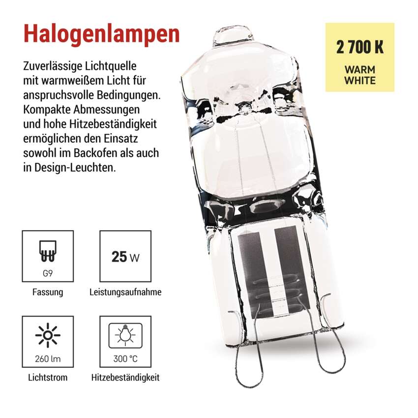 | Sockel (Befestigung der Glühbirne) | G9 |