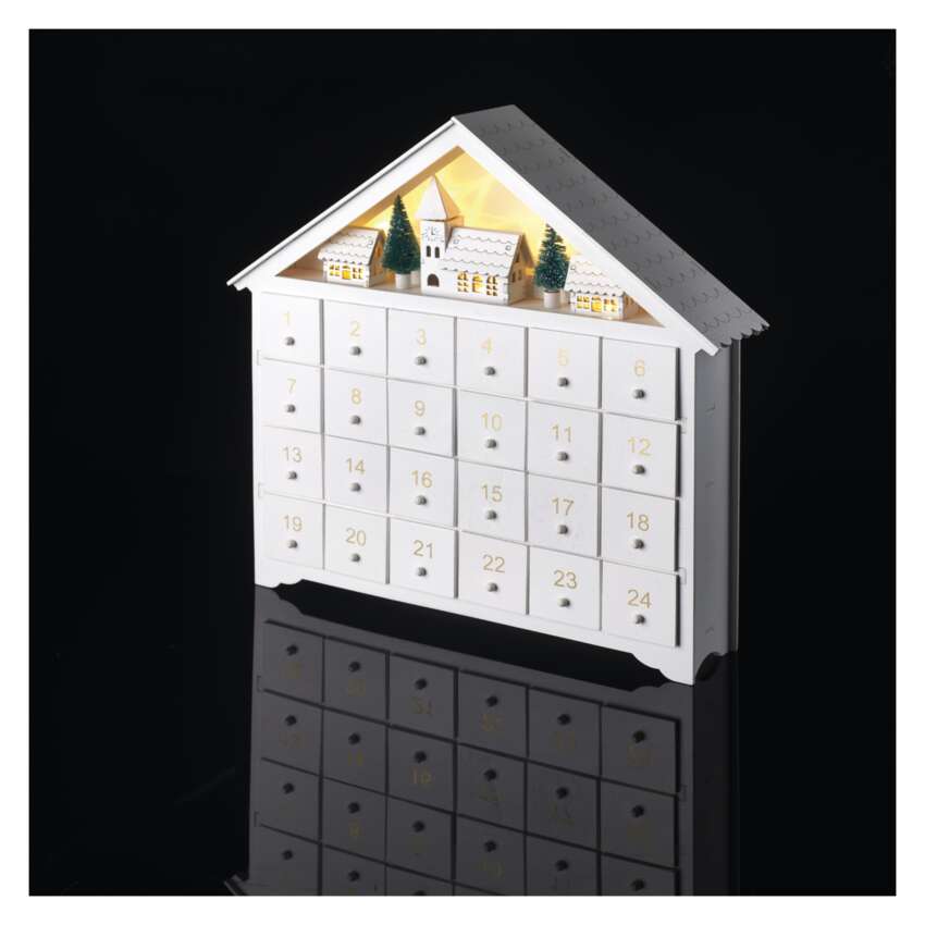 LED Adventskalender aus Holz, 35x33 cm, 2x AA, Innen, warmweiss, Timer