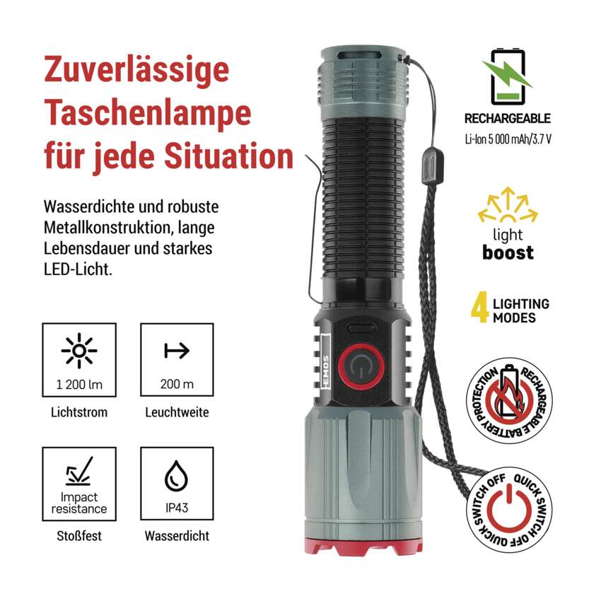 LED Aufladbare Metall-Taschenlampe 1200 lm, 2200 mAh