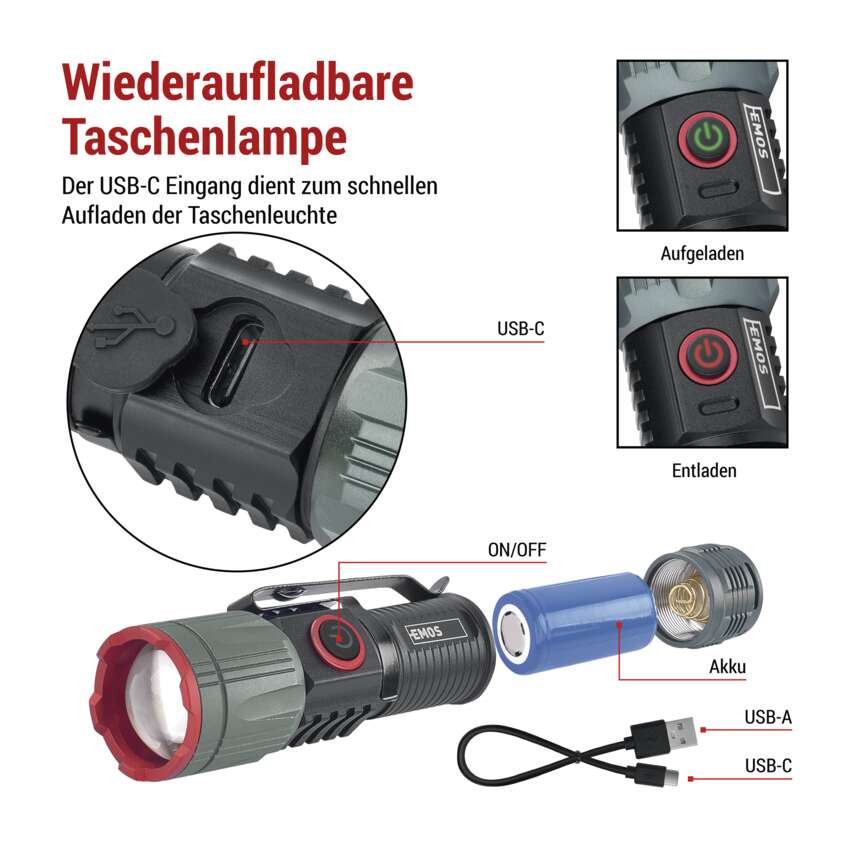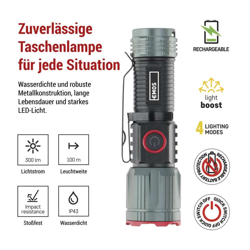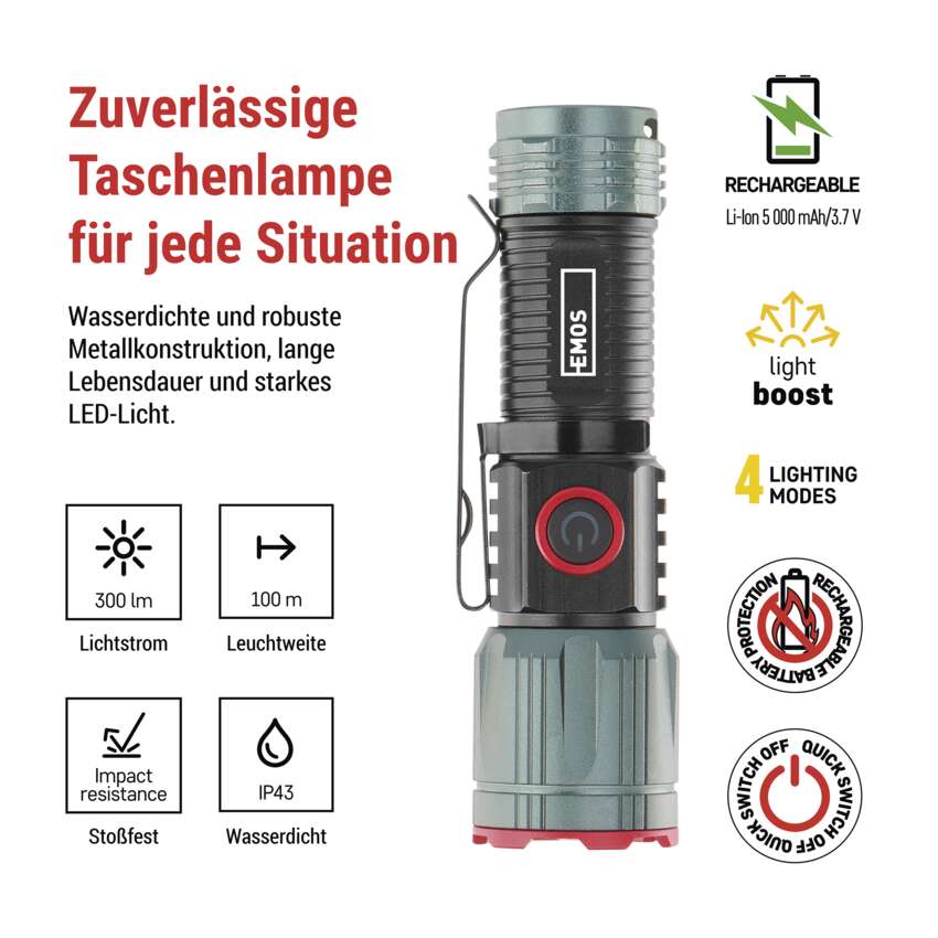 LED Aufladbare Metall-Taschenlampe 300 lm, 700 mAh