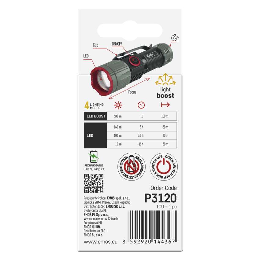 | Lichtstrom | LED BOOST – 300 lm, LED 100 % – 160 lm, LED 50 % – 100 lm, LED 10 % – 15 lm |