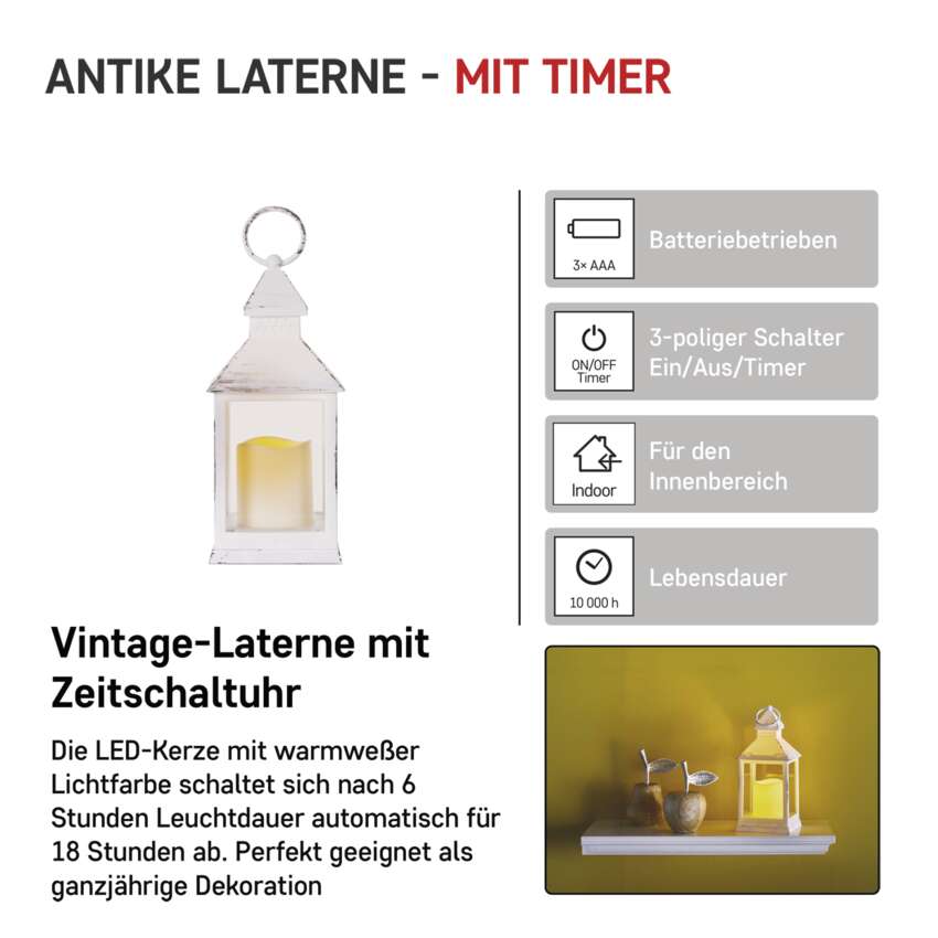 LED Dekoration – Laterne antik weiß blinkend, 3x AAA, Innen, Vintage, Timer