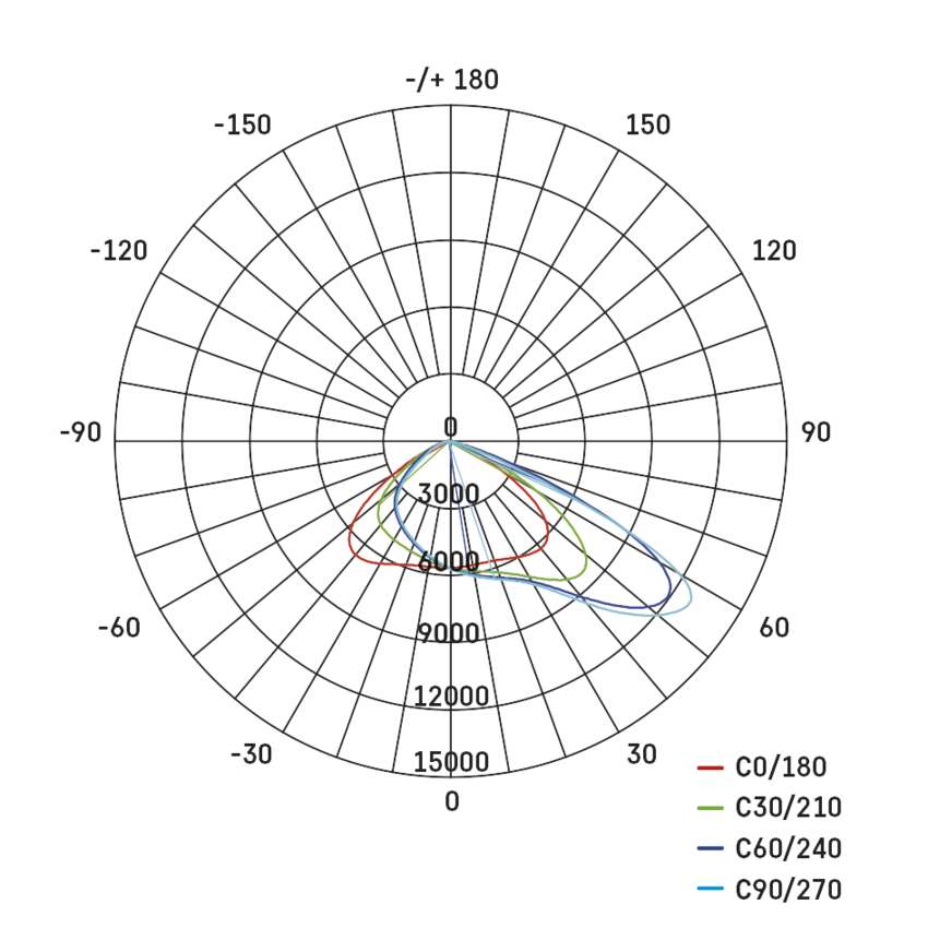 Dank der verwendeten LED-Technologie und der Form des Diffusors beleuchtet der Strahler den Raum in einem Winkel von 55° × 125° bei der ASYMMETRISCHEN Variante, in einem Winkel von 26° × 60° bei der BILLBOARD-Variante und in einem Winkel von 60° bei der NARROW-Variante.