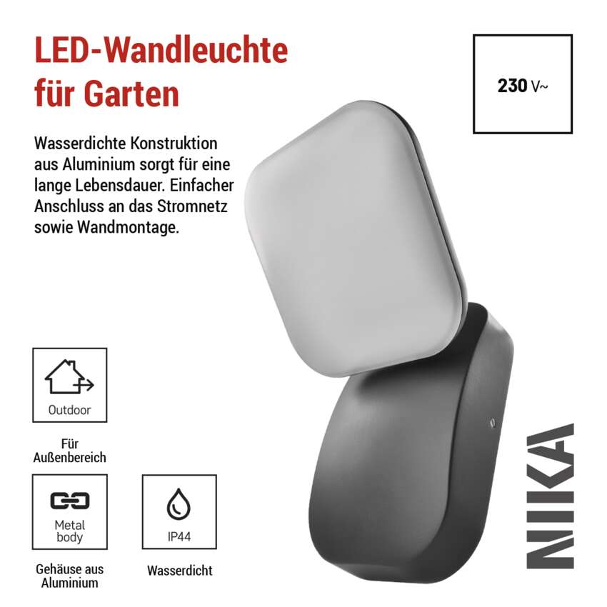 Die Gartenleuchten der Serie NIKA vereinen elegantes Design mit hochwertiger LED-Beleuchtung in warmweißer Farbe - die perfekte Ergänzung für jeden Außenbereich. Dank der präzisen Verarbeitung und der langlebigen Materialien bieten sie unter allen Bedingungen eine zuverlässige Leistung. Das NIKA-Sortiment bietet verschiedene Modelle von Wand- und Säulenleuchten, einschließlich eines PIR-Sensor-Modells, so dass Sie eine Lösung wählen können, die Ihren Bedürfnissen und dem Stil Ihres Gartens entspricht.