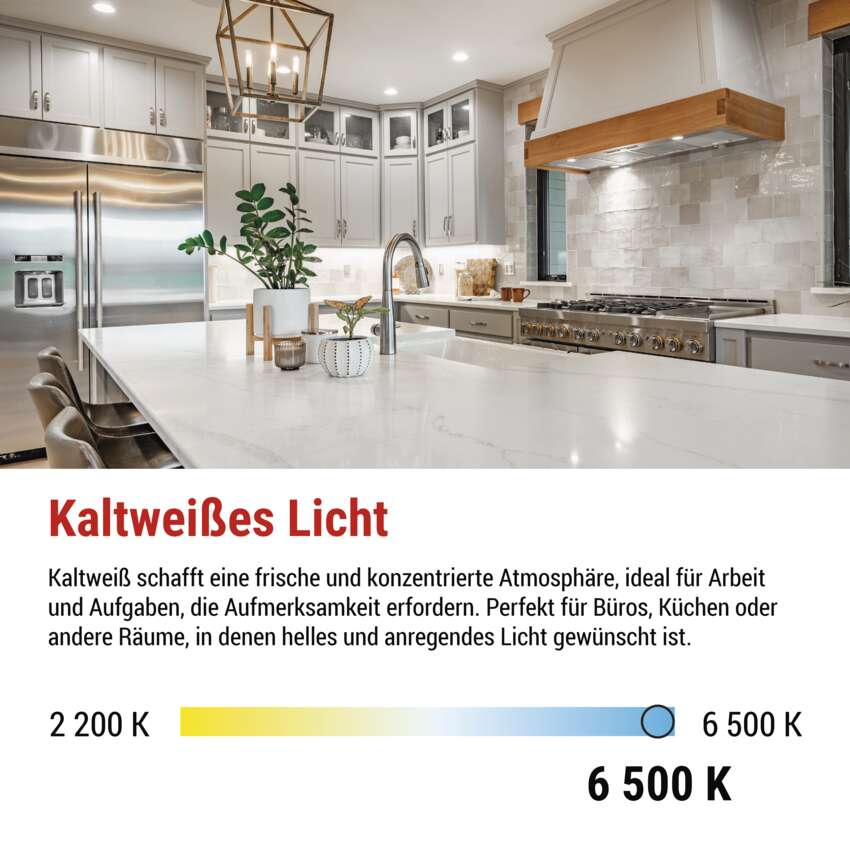 Die kalte Lichtfarbe sorgt für eine sehr helle und klare Beleuchtung, die die Konzentration und Präzision fördert. Dank ihres kühleren Farbtons gewährleistet sie eine hervorragende Sichtbarkeit von Details und ist ideal für Arbeits- und Technikräume.