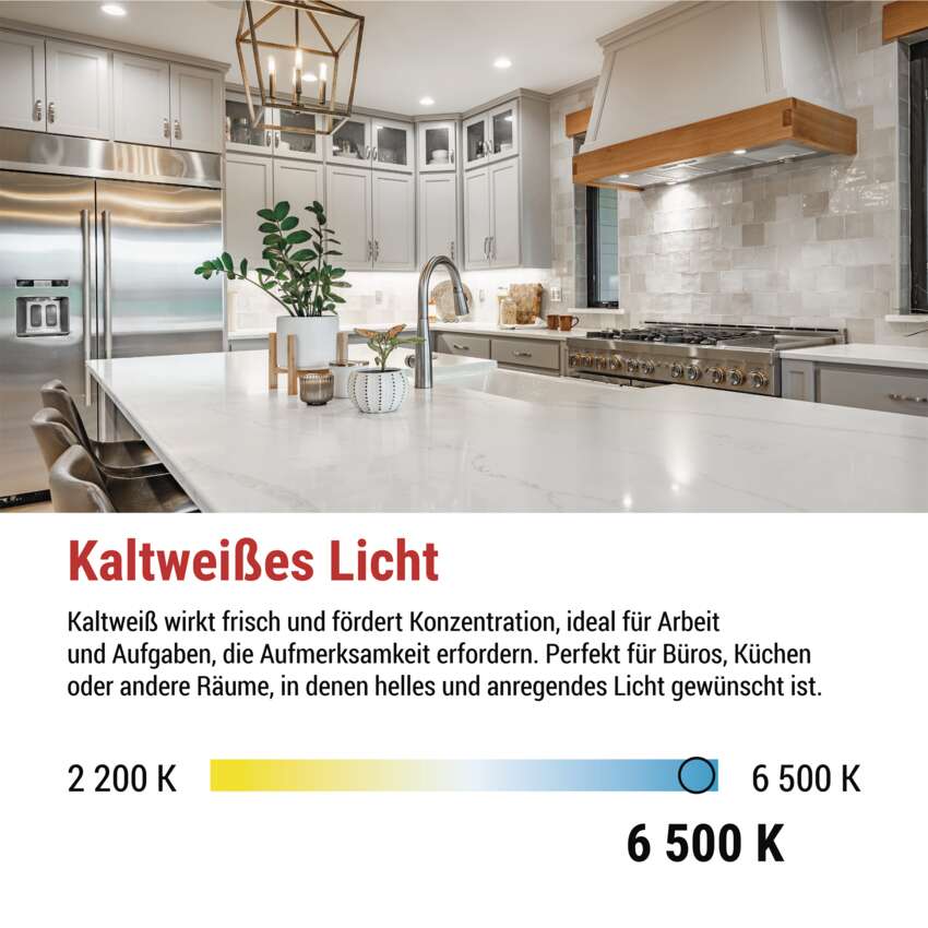 Kaltweiß verleiht dem Raum ein helles und klares Aussehen, das energiegeladen und frisch wirkt. Dank seiner Intensität sorgt es für optimale Beleuchtung zum Lesen, Schreiben oder für andere Aktivitäten, bei denen maximale Sichtbarkeit und Konzentration erforderlich sind.