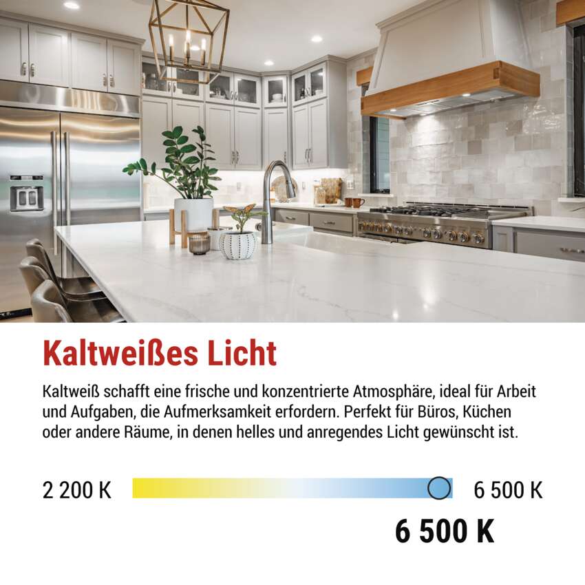 Die kalte Lichtfarbe sorgt für eine sehr helle und klare Beleuchtung, die die Konzentration und Präzision fördert. Dank ihres kühleren Farbtons gewährleistet sie eine hervorragende Sichtbarkeit von Details und ist ideal für Arbeits- und Technikräume.