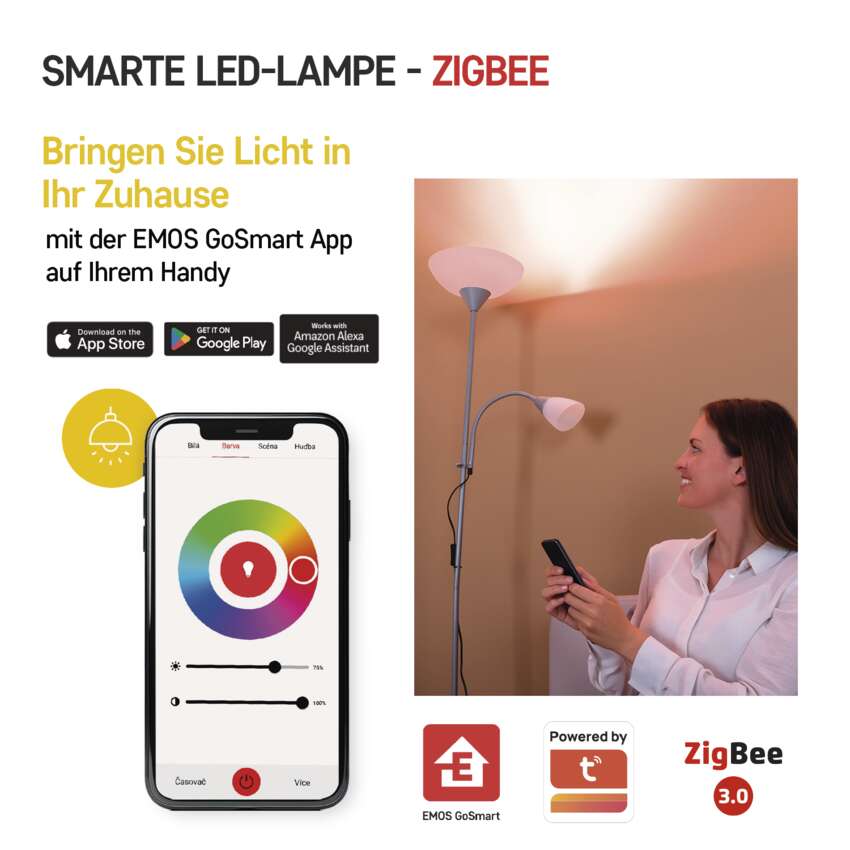 Die Installation der EMOS GoSmart Smart Bulbs ist sehr einfach. Setzen Sie sie einfach in die Leuchte, verbinden Sie sie mit dem Zigbee-Gateway und koppeln Sie sie mit der EMOS GoSmart Mobile App, die sowohl für Android als auch für iOS verfügbar ist. Dank der Kompatibilität mit Amazon Alexa und Google Assistant können Sie auch die Sprachsteuerung nutzen.