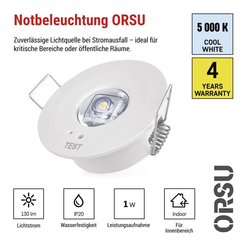 Der ORSU IP20 Notlichtstrahler sorgt für helles und zuverlässiges Licht bei Stromausfall. Mit seiner einfachen Installation und seinem modernen Design sorgt er für eine sichere Orientierung in Büros, Geschäftsräumen und Wohnungen und macht jeden Weg sicher und gut sichtbar.