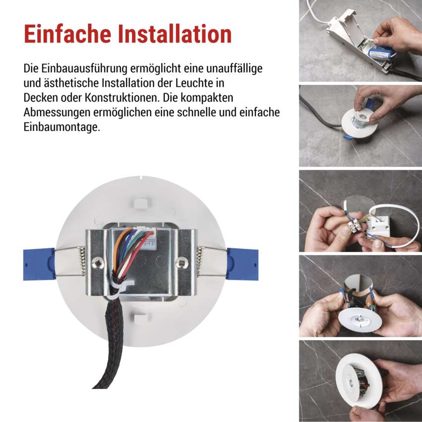 >Dank der klaren Anleitung und der universellen Befestigungsmöglichkeiten können Sie die Leuchte ganz einfach in der Decke installieren, ohne dass ein Fachmann hinzugezogen werden muss. Die Installation ist schnell, sicher und intuitiv.