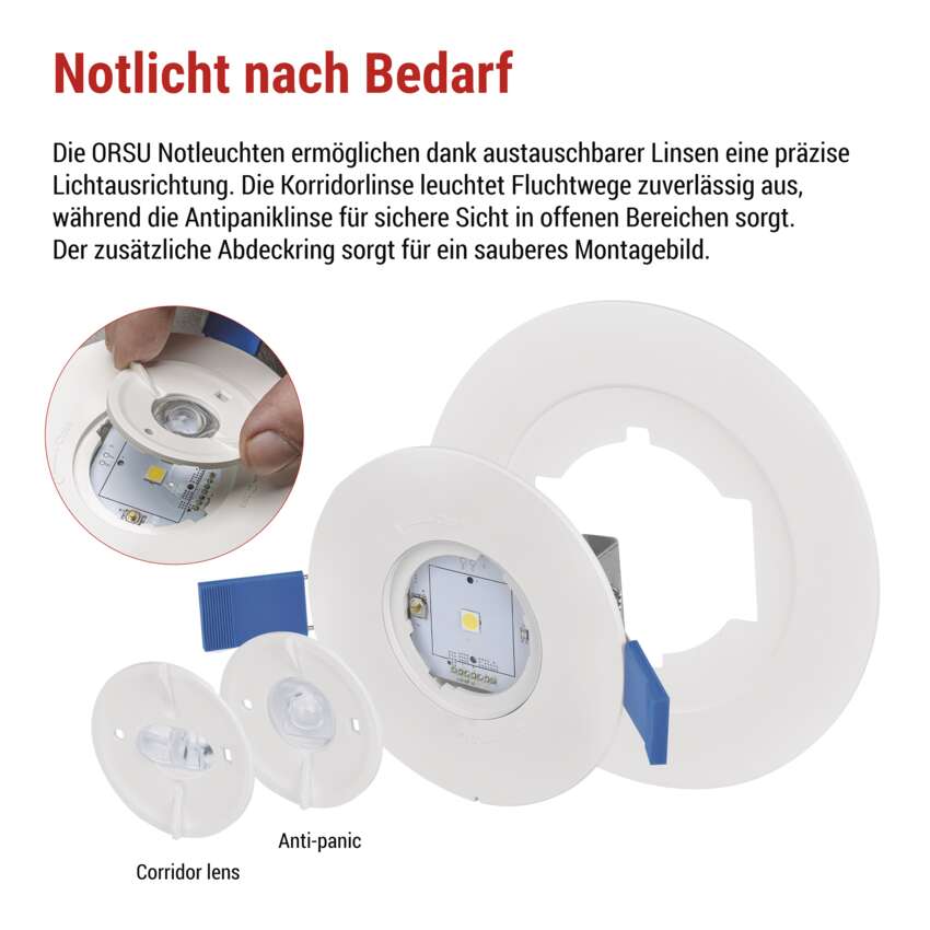 Die Linsen ermöglichen es, die Beleuchtung an die spezifischen Bedürfnisse des Raumes anzupassen. Die Korridorlinse wird in engen Fluren und Gängen wie Büros, Schulen oder Hotels eingesetzt, wo sie das Licht entlang des Weges lenkt und für eine gleichmäßige und klare Kennzeichnung des Fluchtweges sorgt. Die Anti-Panik-Linse ist für offene Räume wie Lobbys, Foyers oder öffentliche Räume konzipiert und ermöglicht durch ihre breite Lichtstreuung eine sichere Orientierung und Bewegung, auch wenn sich mehrere Personen gleichzeitig im Raum aufhalten. Beide Linsen bieten somit eine zuverlässige und sichere Beleuchtung, die genau auf die Beschaffenheit des Raumes und seine Bedürfnisse abgestimmt ist.