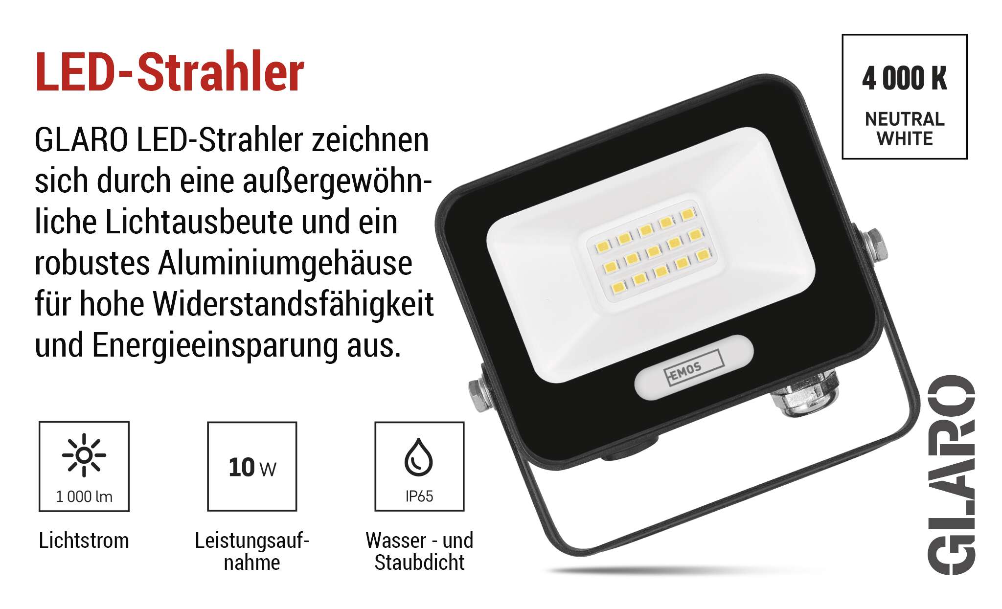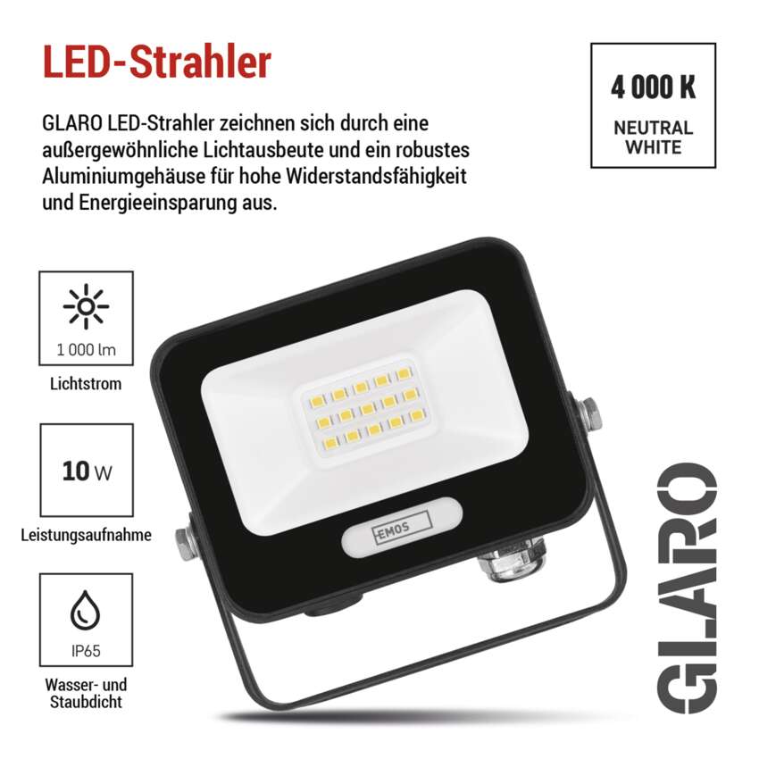 Die LED-Fluter der GLARO-Serie bieten eine zuverlässige Lichtleistung, hohe Effizienz und lange Lebensdauer. Mit der Schutzart IP65 sind die Strahler für den Außeneinsatz bestens gerüstet und können Regen, Staub und niedrigen Temperaturen problemlos standhalten. Das robuste Aluminiumgehäuse gewährleistet eine ausgezeichnete mechanische Beständigkeit und eine effiziente Wärmeableitung. Sie sind die ideale Wahl für die Beleuchtung von Häusern, Gärten, Garagen und Geschäftsräumen. Sie verbinden hohe Leistung mit einem erschwinglichen Preis, so dass sie von jedem Benutzer geschätzt werden.