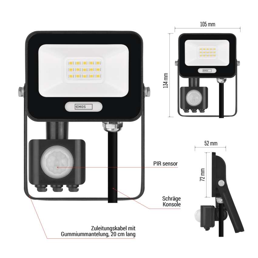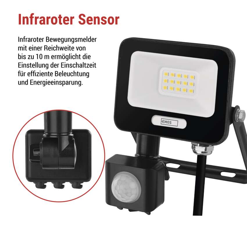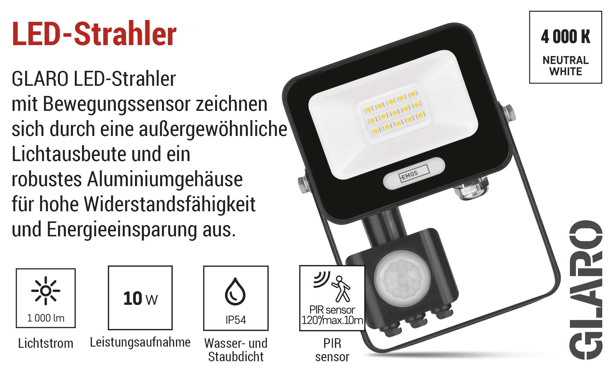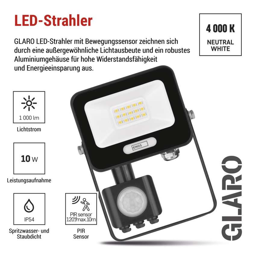 LED-Strahler GLARO mit PIR-Sensor bringen komfortable und energiesparende Außenbeleuchtung. Dank automatischer Umschaltung bei Bewegungserkennung leuchten sie nur dann, wenn Sie sie wirklich brauchen - ideal für mehr Sicherheit und Komfort auf Ihrem Grundstück. Die Fluter eignen sich für die Montage unter dem Dach oder an der Wand eines Gebäudes und sind nach IP54 geschützt. Sie sind eine praktische Lösung für die Beleuchtung von Eingängen, Garagen, Gartenwegen, Einfahrten und Geschäftsräumen. Die einfache Einstellung der Sensorempfindlichkeit und der Beleuchtungsdauer ermöglicht eine individuelle Anpassung an Ihre Bedürfnisse.