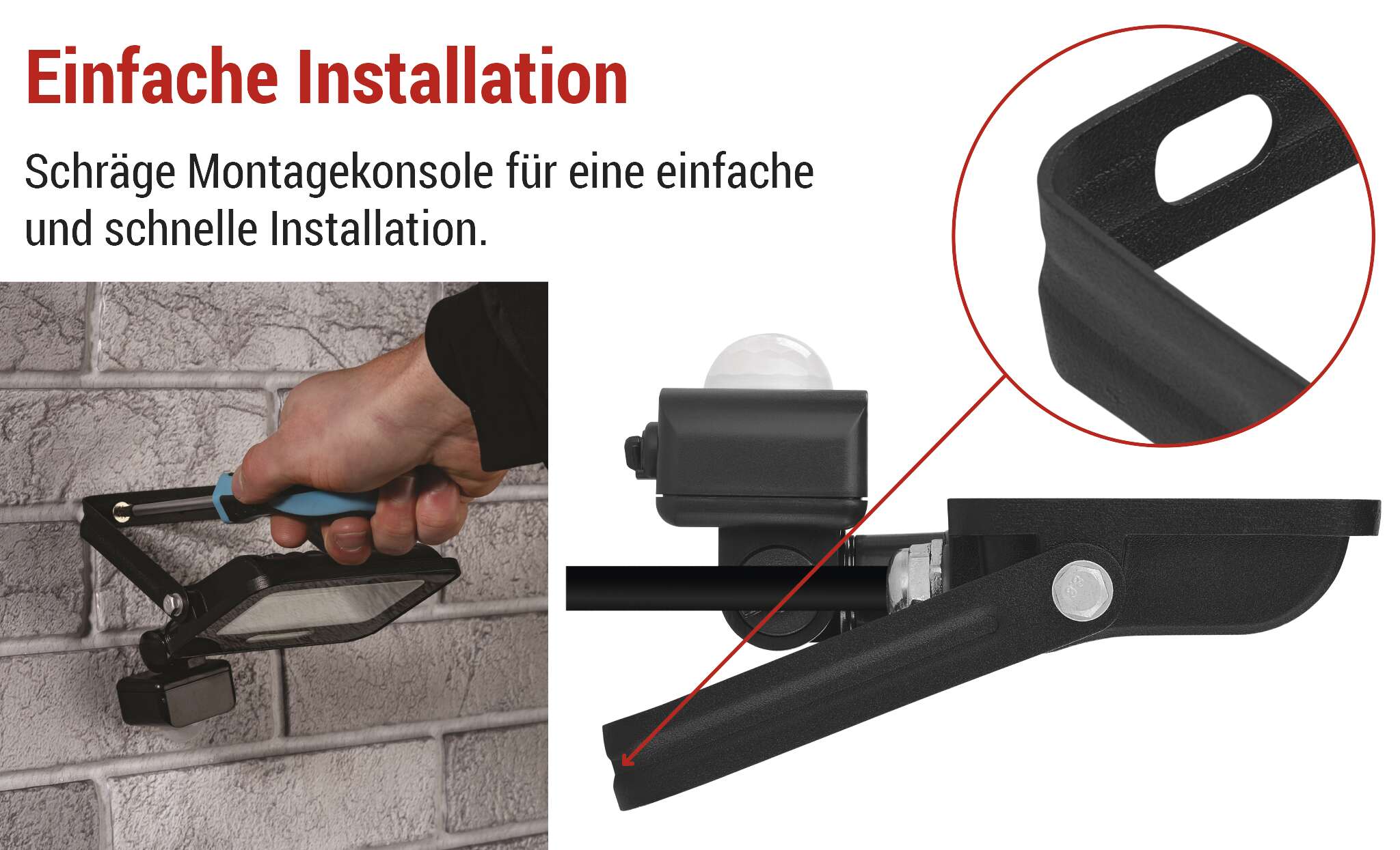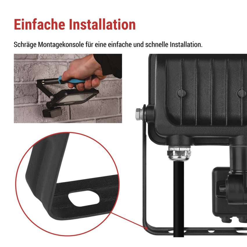 Die GLARO PIR-Reflektoren sind mit einer praktischen Winkelhalterung ausgestattet, die eine schnelle und bequeme Installation an einer Wand, Fassade oder einem anderen Untergrund ermöglicht. Durch die Möglichkeit, den Beleuchtungswinkel genau nach Bedarf einzustellen, können Sie das Licht dorthin lenken, wo es am meisten benötigt wird, ohne dass komplizierte Bohrungen oder Einstellungen erforderlich sind. Die einfache Installation spart Zeit und Mühe und macht GLARO zur idealen Wahl für Hausinstallationen.