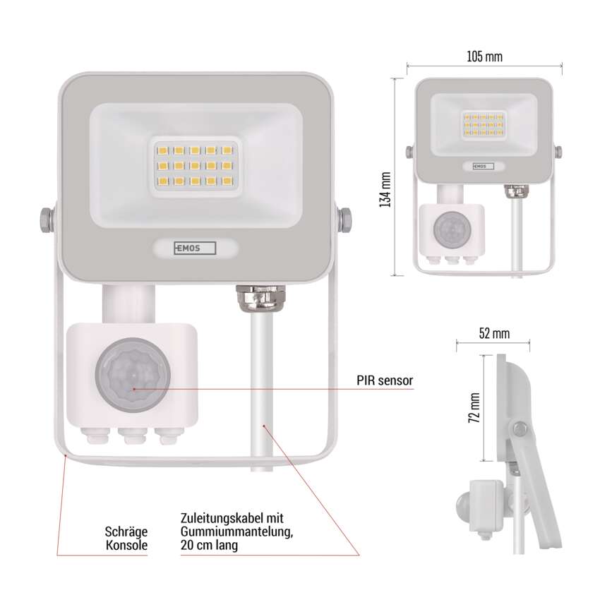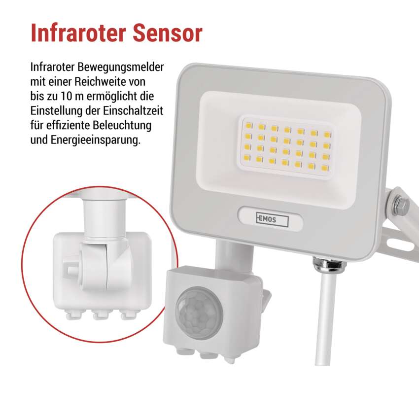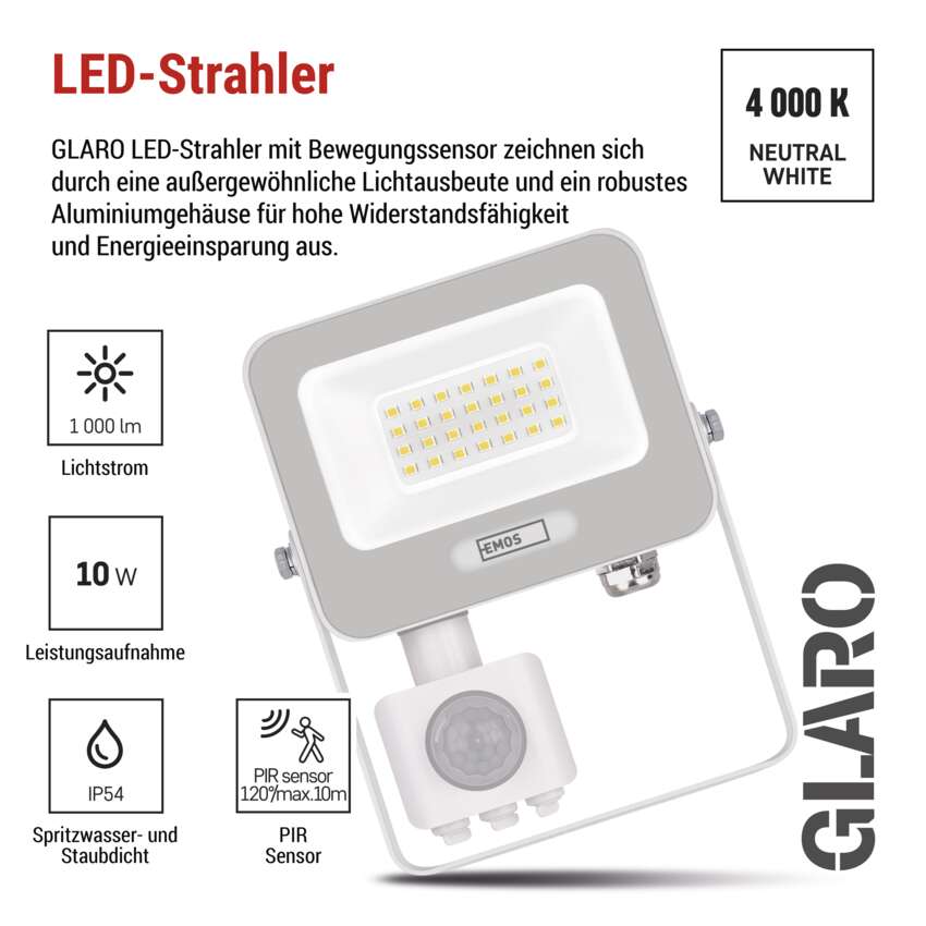 LED-Strahler GLARO mit PIR-Sensor bringen komfortable und energiesparende Außenbeleuchtung. Dank automatischer Umschaltung bei Bewegungserkennung leuchten sie nur dann, wenn Sie sie wirklich brauchen - ideal für mehr Sicherheit und Komfort auf Ihrem Grundstück. Die Fluter eignen sich für die Montage unter dem Dach oder an der Wand eines Gebäudes und sind nach IP54 geschützt. Sie sind eine praktische Lösung für die Beleuchtung von Eingängen, Garagen, Gartenwegen, Einfahrten und Geschäftsräumen. Die einfache Einstellung der Sensorempfindlichkeit und der Leuchtdauer ermöglicht eine individuelle Anpassung an Ihre Bedürfnisse.