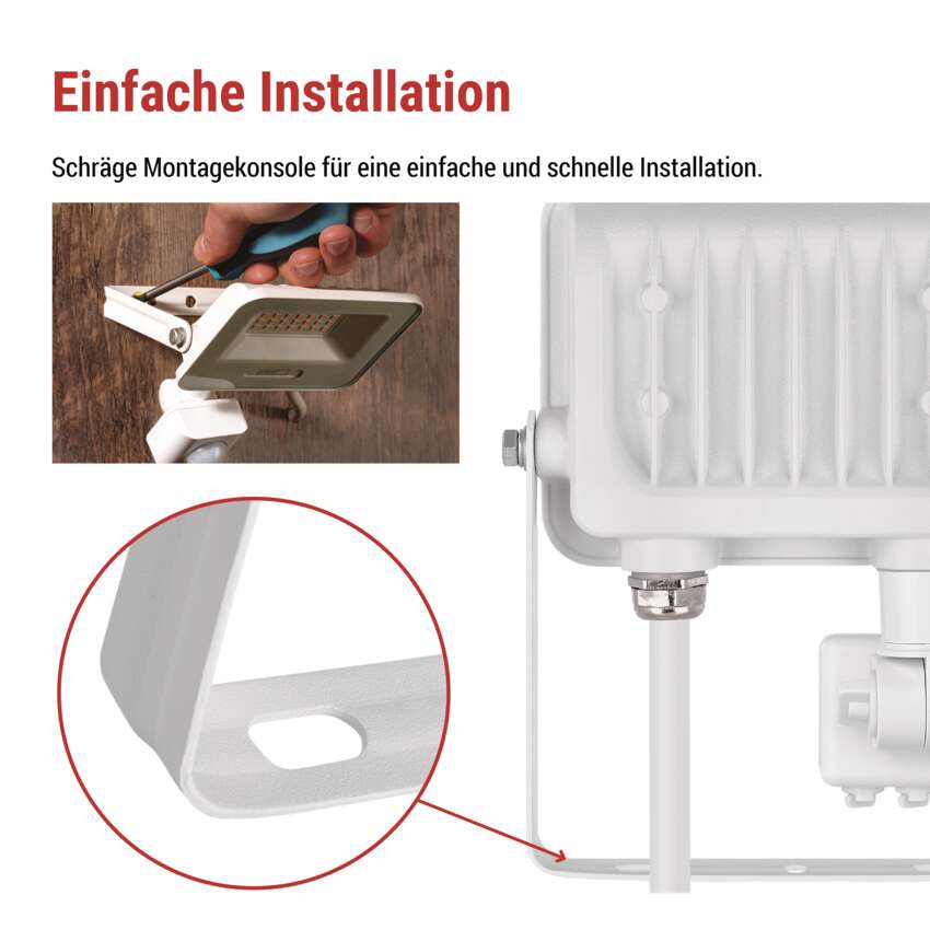 Die GLARO PIR-Reflektoren sind mit einer praktischen Winkelhalterung ausgestattet, die eine schnelle und bequeme Installation an einer Wand, Fassade oder einem anderen Untergrund ermöglicht. Durch die Möglichkeit, den Beleuchtungswinkel genau nach Bedarf einzustellen, können Sie das Licht dorthin lenken, wo es am meisten benötigt wird, ohne dass komplizierte Bohrungen oder Einstellungen erforderlich sind. Die einfache Installation spart Zeit und Mühe und macht GLARO zur idealen Wahl für Hausinstallationen.