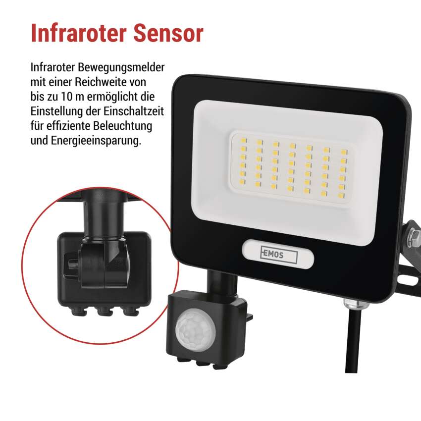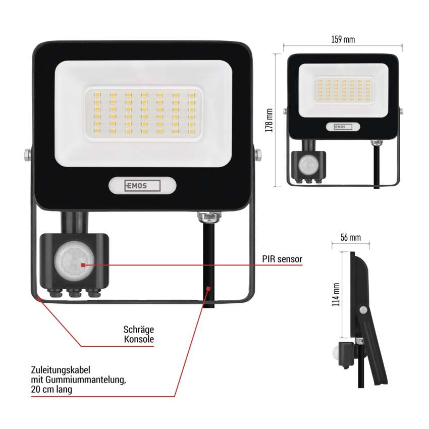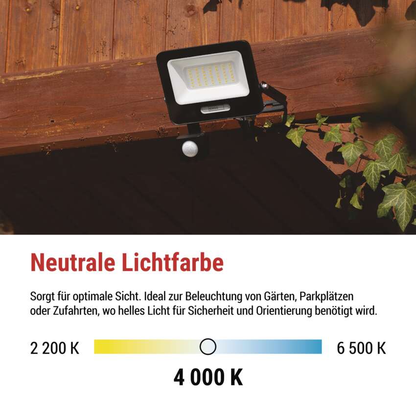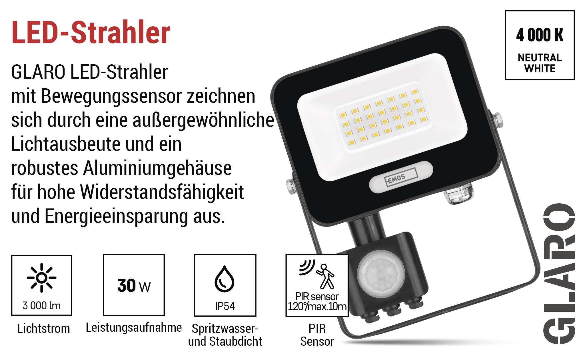 LED reflektor GLARO mit Bewegungssensor, 30 W, schwarz, IP54, 3000 lm, neutralweiß