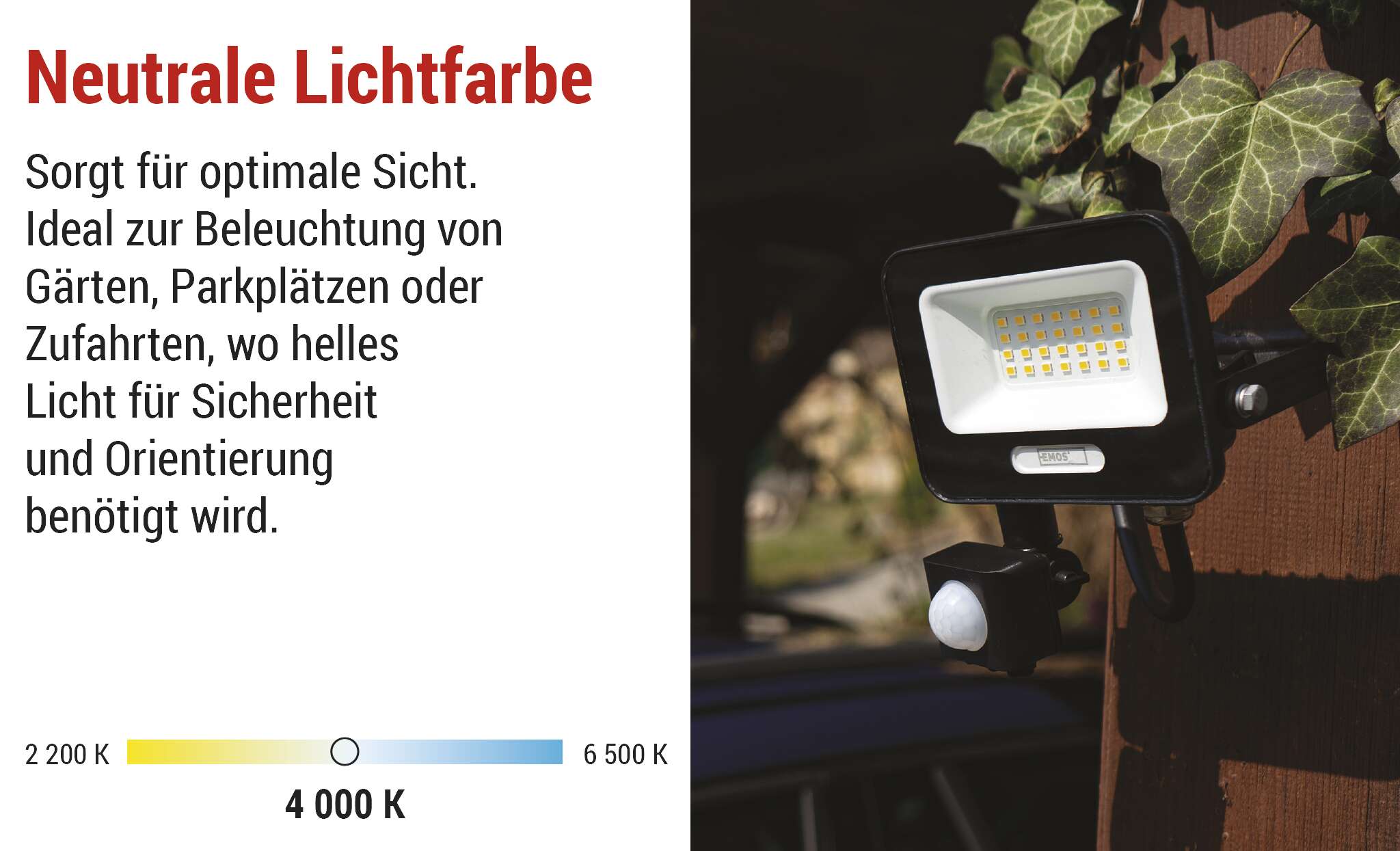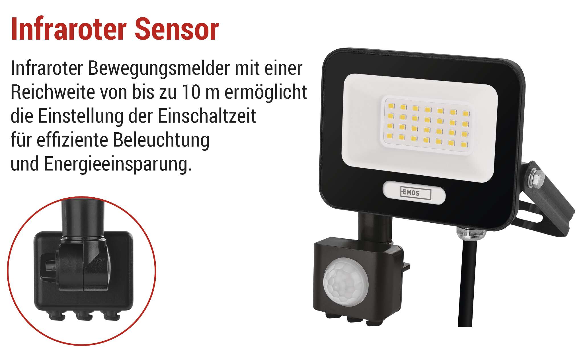LED-Strahler GLARO mit PIR-Sensor bringen komfortable und energiesparende Außenbeleuchtung. Dank automatischer Umschaltung bei Bewegungserkennung leuchten sie nur dann, wenn Sie sie wirklich brauchen - ideal für mehr Sicherheit und Komfort auf Ihrem Grundstück. Die Fluter eignen sich für die Montage unter dem Dach oder an der Wand eines Gebäudes und sind nach IP54 geschützt. Sie sind eine praktische Lösung für die Beleuchtung von Eingängen, Garagen, Gartenwegen, Einfahrten und Geschäftsräumen. Die einfache Einstellung der Sensorempfindlichkeit und der Beleuchtungsdauer ermöglicht eine individuelle Anpassung an Ihre Bedürfnisse.