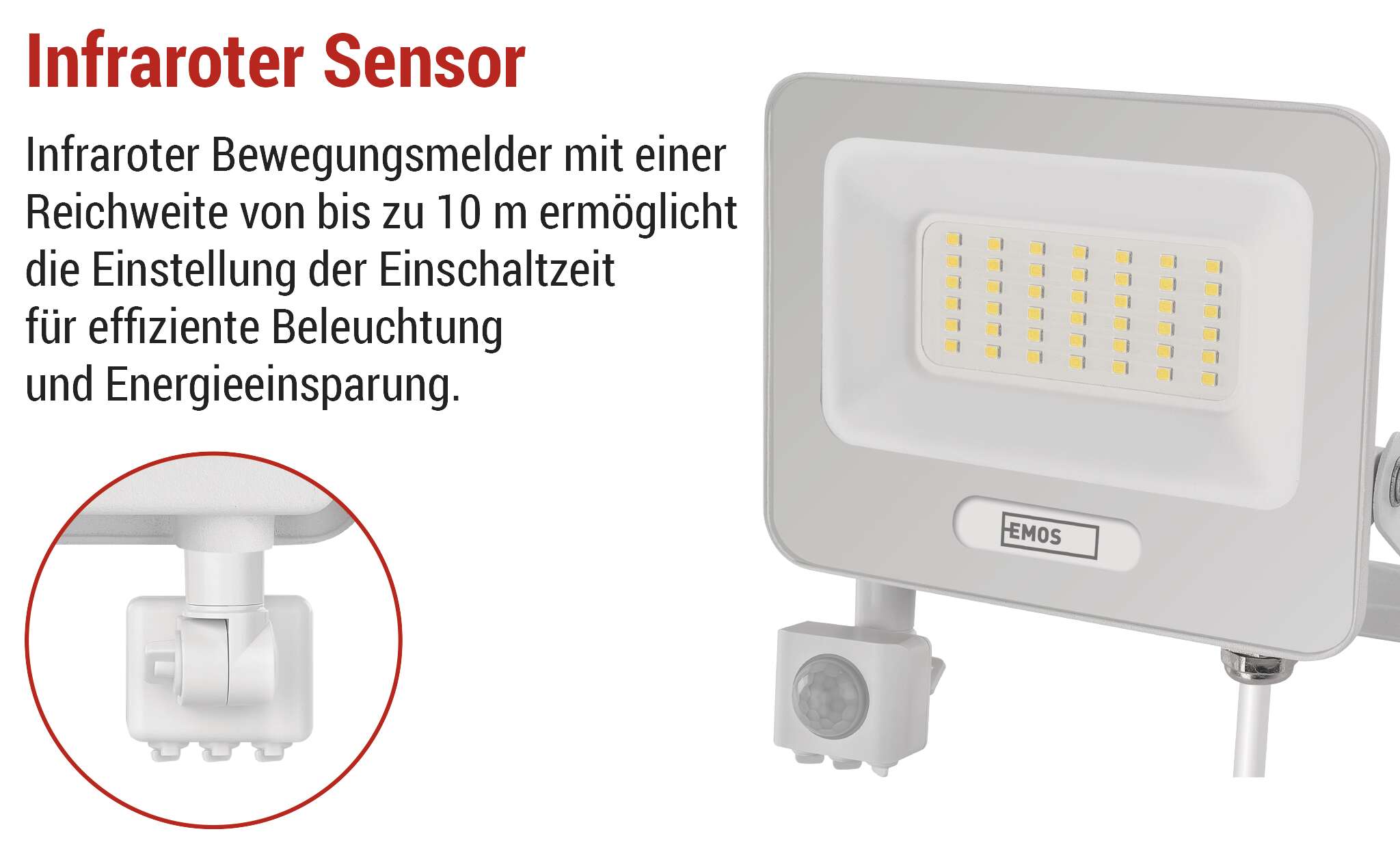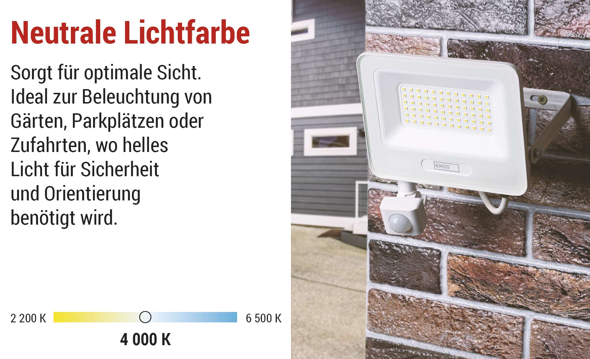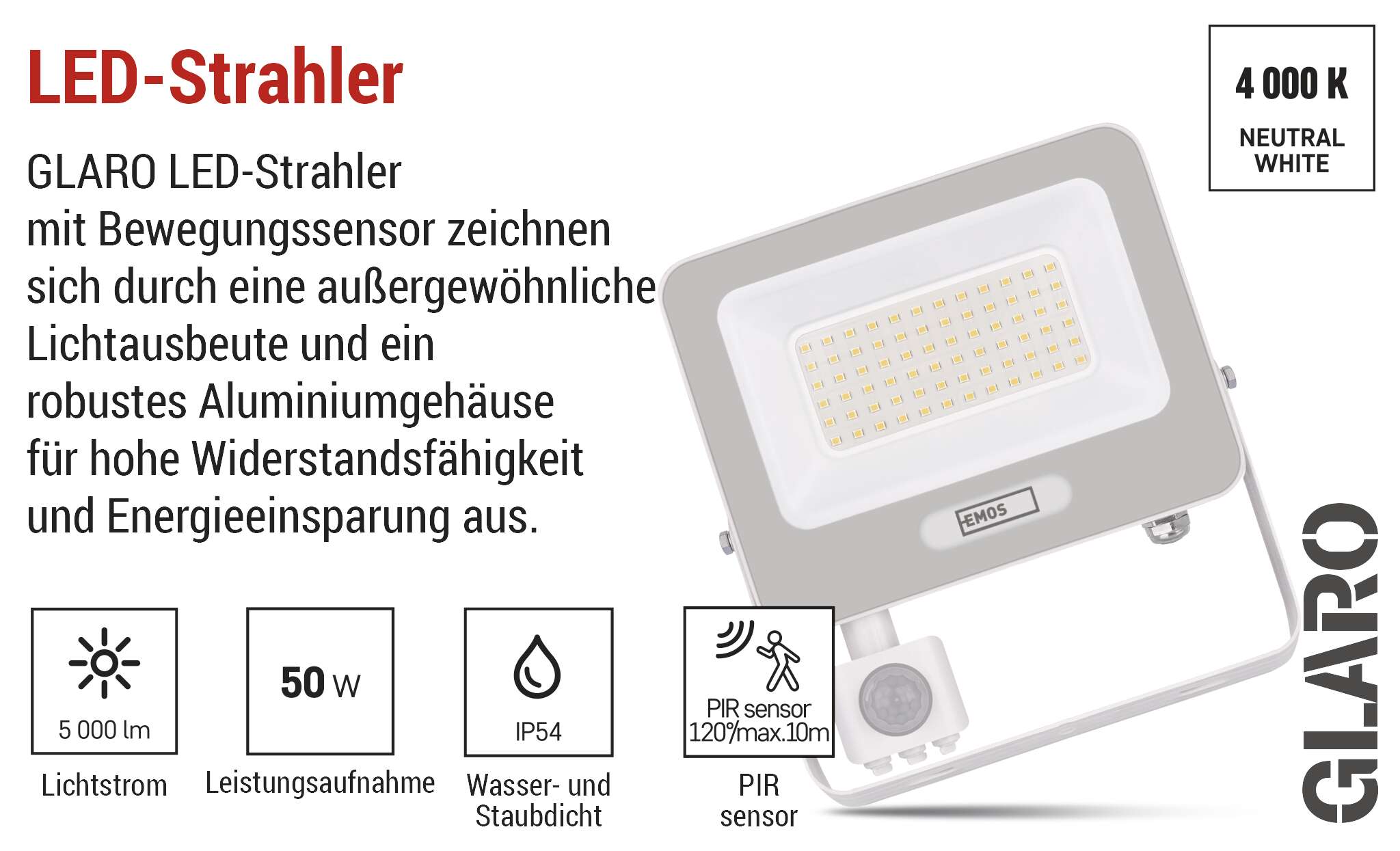 LED reflektor GLARO mit Bewegungssensor, 50 W,weiß, IP54, 5000 lm, neutralweiß