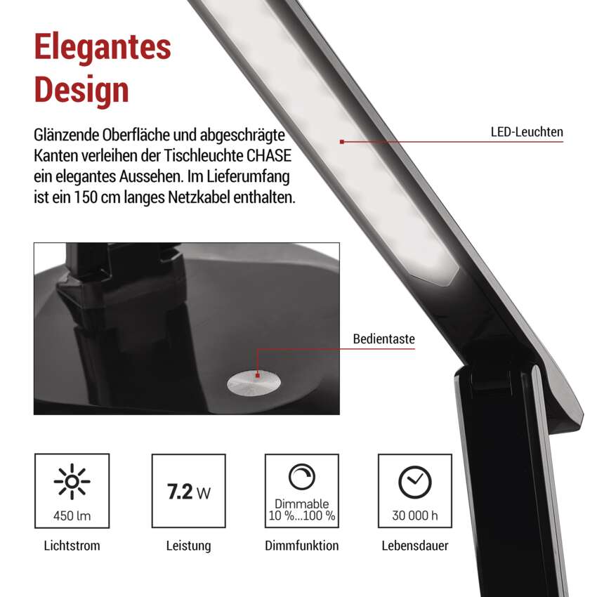 Představujeme vám naši stolní lampičku CHASE. Tato lampička má čistý design a je velmi snadná na použití, což ocení každý uživatel. Díky stabilní konstrukci se nemusíte obávat, že by se vám lampička převrátila. Lampička se pyšní lesklým designem, který dodá vašemu pracovnímu prostoru moderní vzhled. Se světelným tokem až 450 lm poskytne dostatek světla pro jakoukoli vaši činnost.