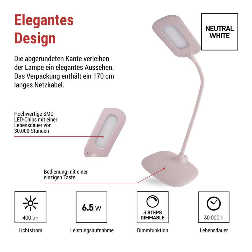 Die stilvolle und funktionale LED-Lampe in Rosa bietet erstklassige Beleuchtung für Arbeit, Studium und abendliche Entspannung. Mit einer hellen Lichtleistung von 400 lm, einem geringen Verbrauch von 6,5 W und einem angenehmen neutralen Weiß von 4 000 K schafft sie optimale Bedingungen für Konzentration und Entspannung.