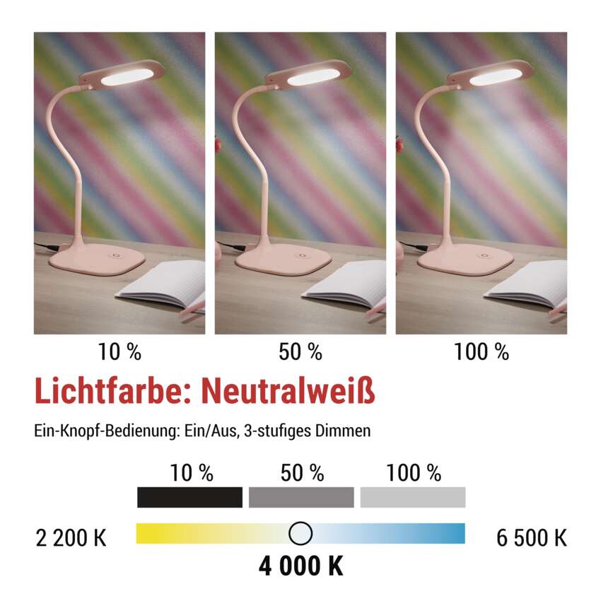 Dank der 3-stufigen Dimmfunktion können Sie die Lichtintensität ganz einfach an Ihre aktuellen Bedürfnisse anpassen – von voller Arbeitshelligkeit bis hin zu angenehm gedämpftem Licht für gemütliche Abende.